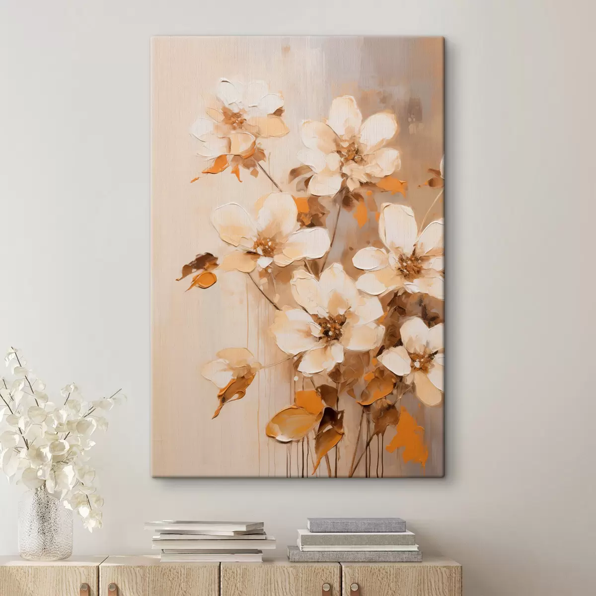 Paveikslas Baltos gėlės su oranžiniais lapais, subtilūs potėpiai, gėlių kompozicija, botanikos menas Nr s45574