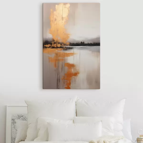 Paveikslas Abstraktus kraštovaizdis su ežeru, medžiu ir geltonu rūku , vanduo atspindi debesuotą dangų Nr s45575