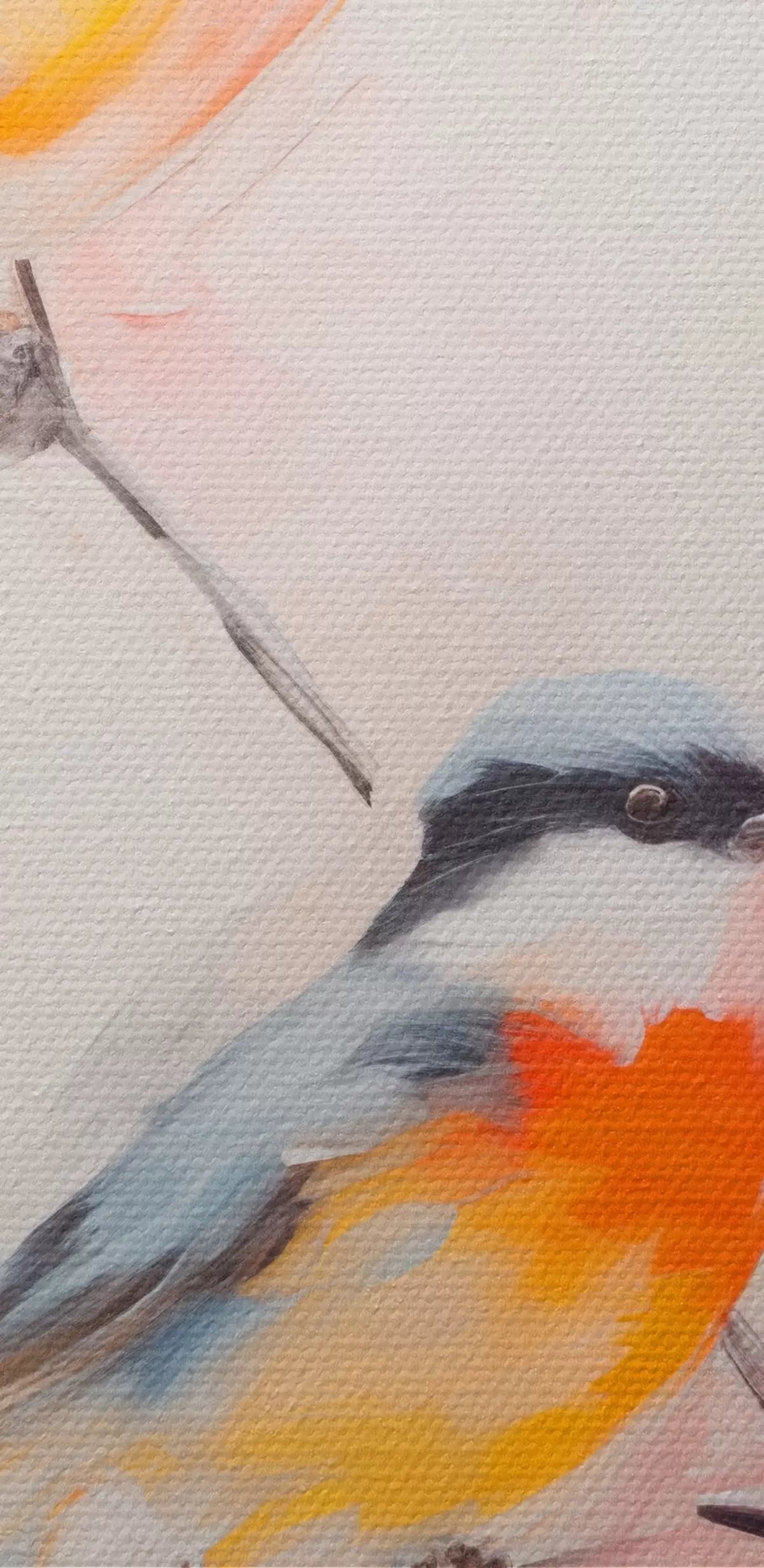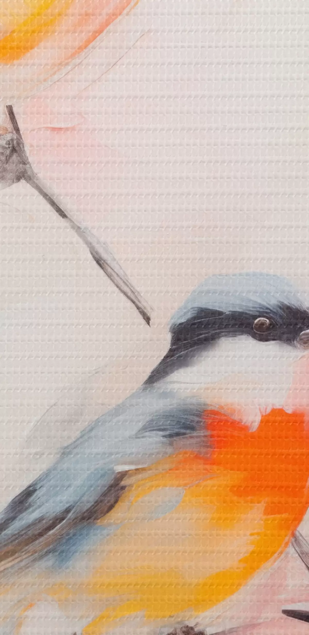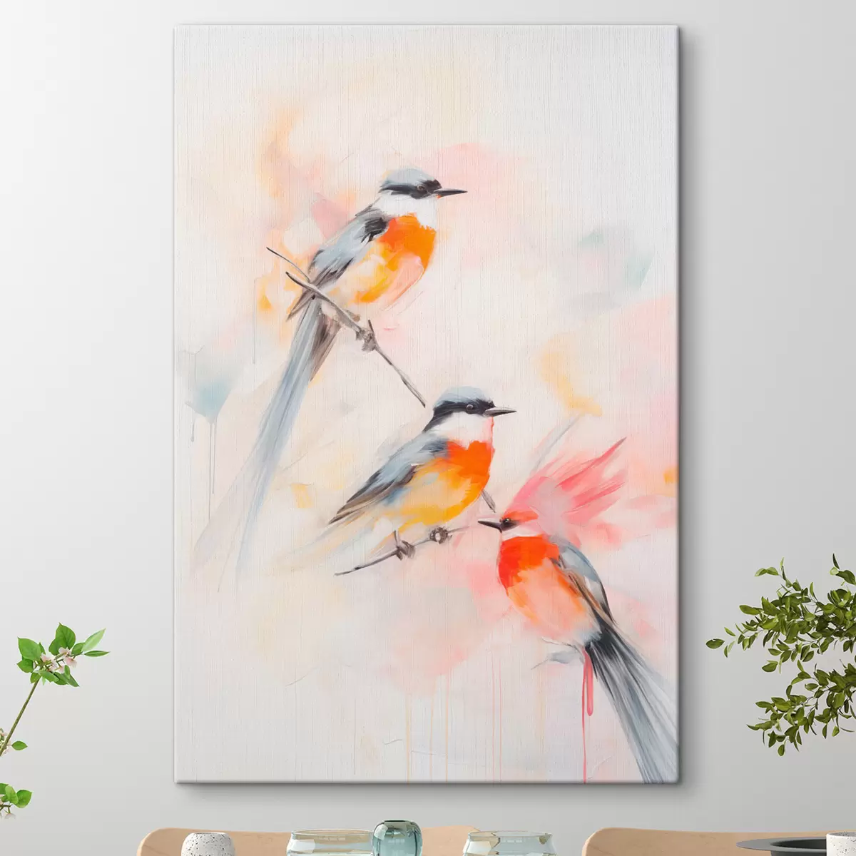 Paveikslas Paukščiai ant šakų , švelnios pastelinės spalvos, šviesus rausvų ir baltų atspalvių fonas Nr s45577