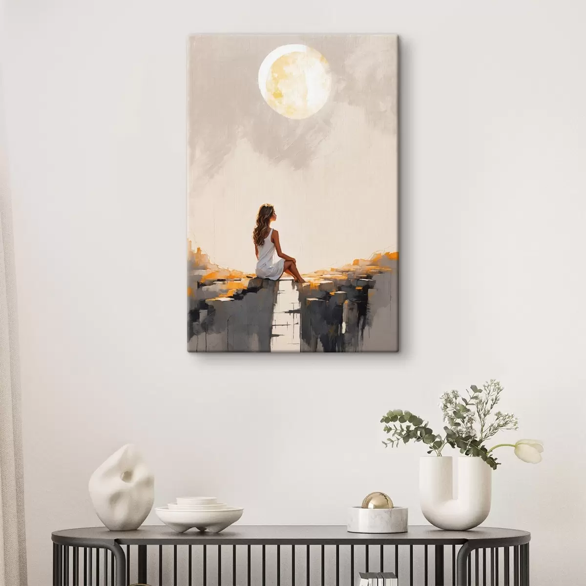Paveikslas Mergina balta suknele sėdi po dideliu mėnuliu Nr s45621