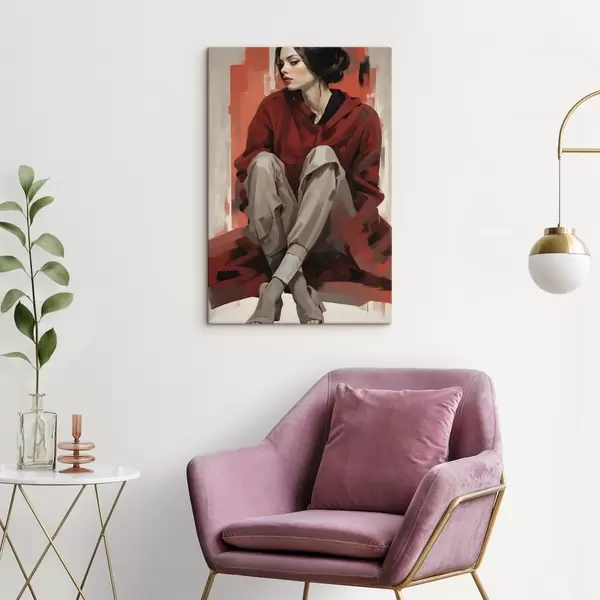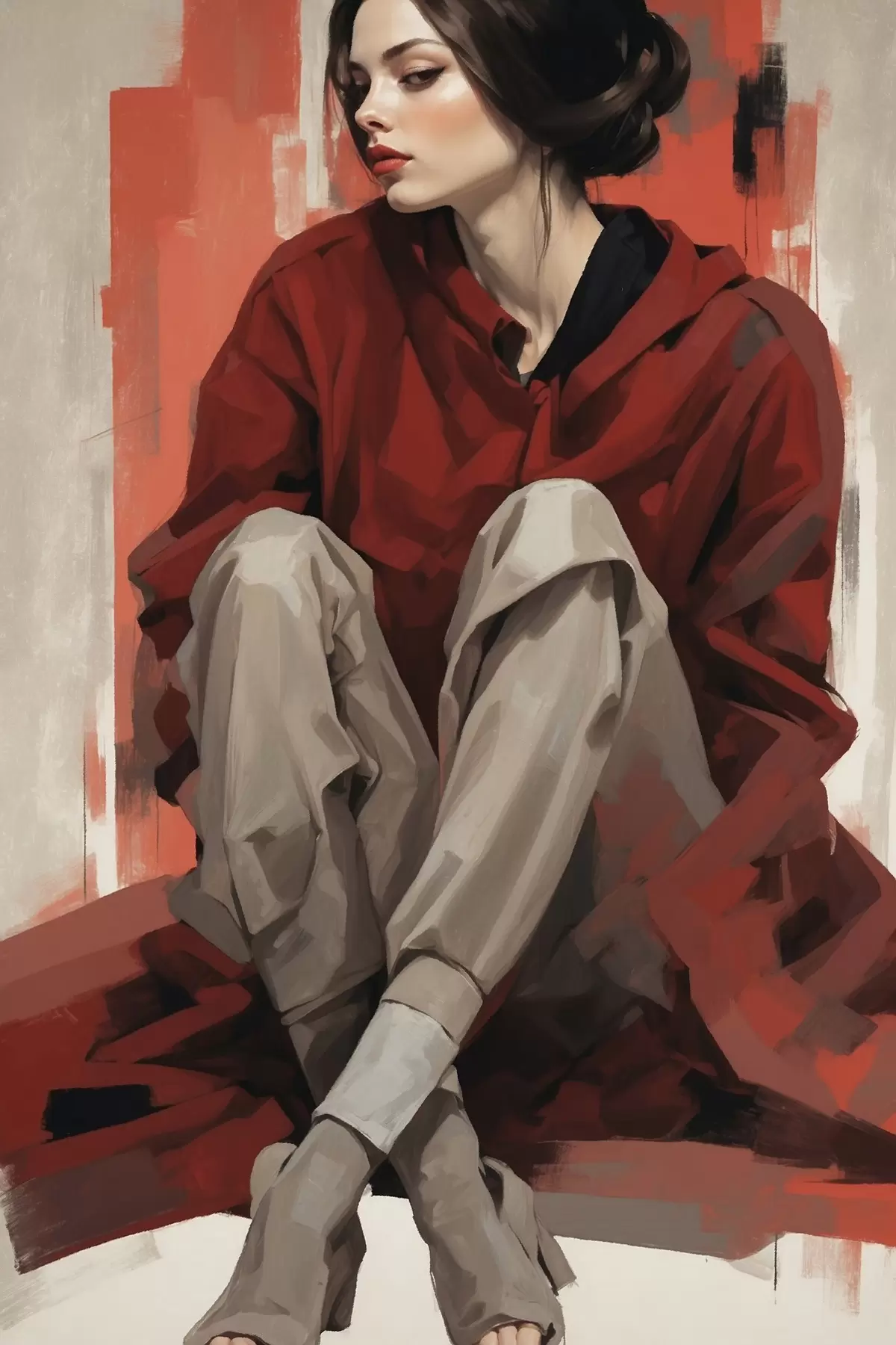 Paveikslas Mergina raudonu apsiaustu, sėdinti sulenktomis kojomis Nr s45624