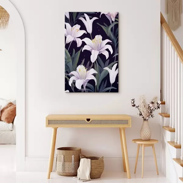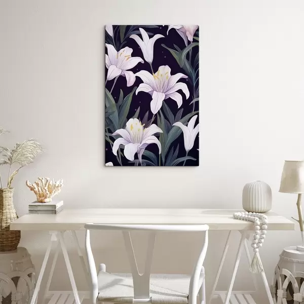 Paveikslas Švelnios lelijos tamsiame fone su žaliais lapais Nr s45697