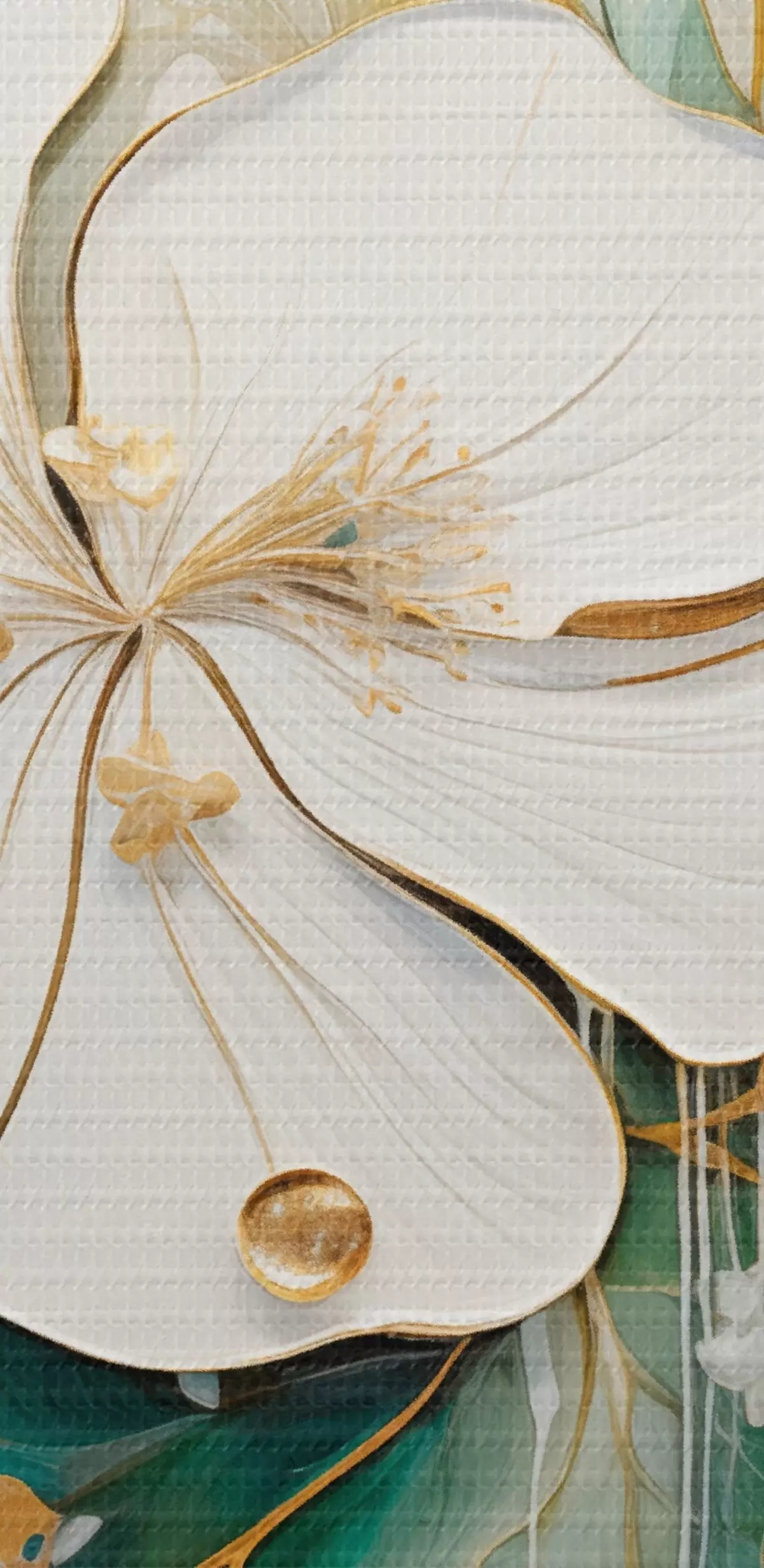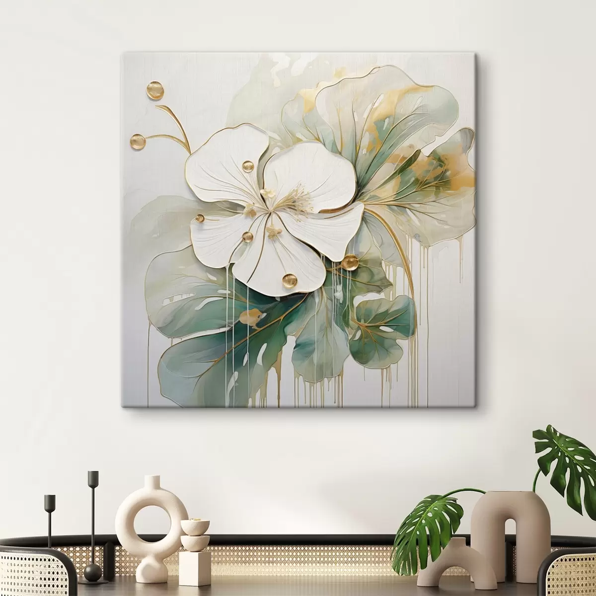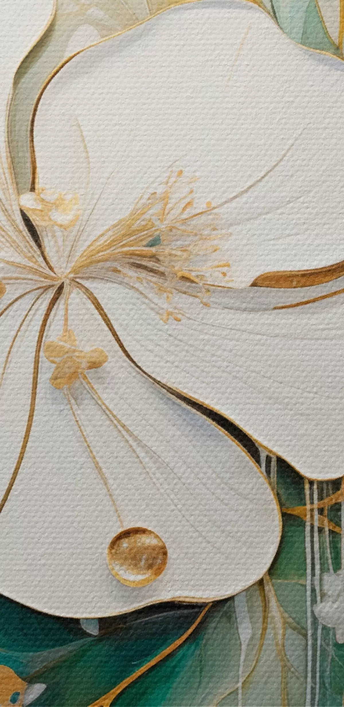 Paveikslas Balta gėlė su geltonai oranžiniais akcentais ir žaliais lapais Nr s45815
