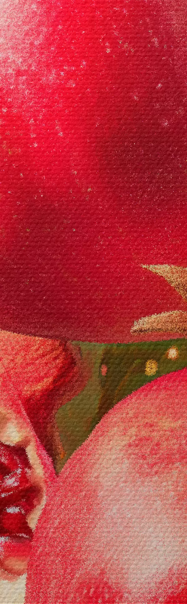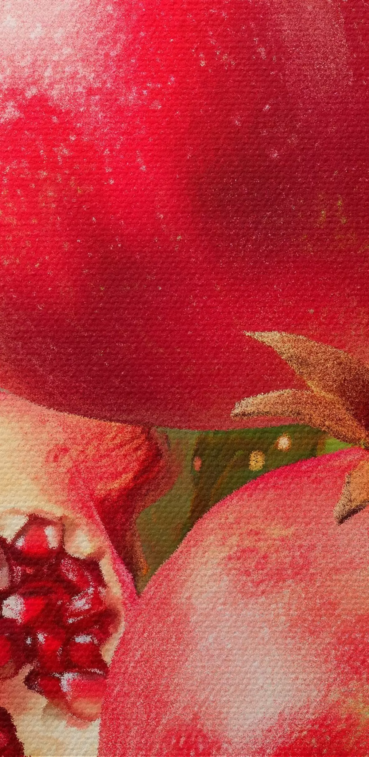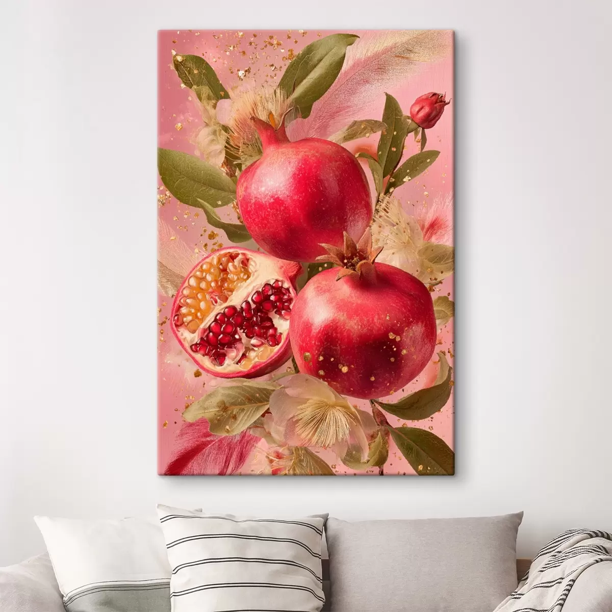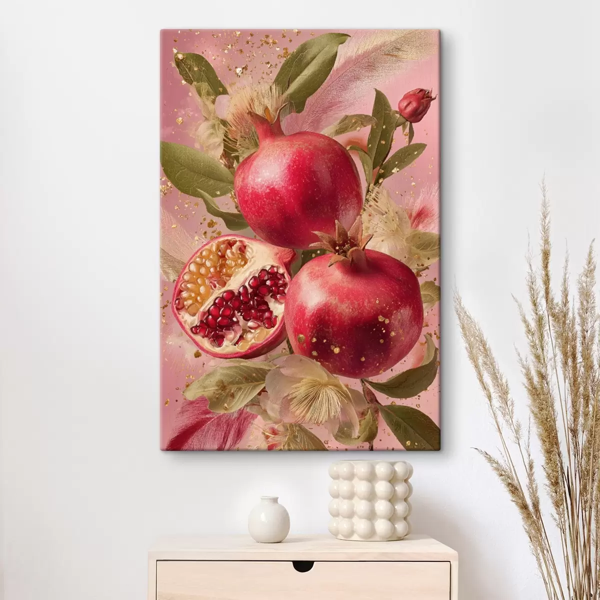 Paveikslas Subrendę granatai ant rožinio fono su lapais ir dėmėmis Nr s45868