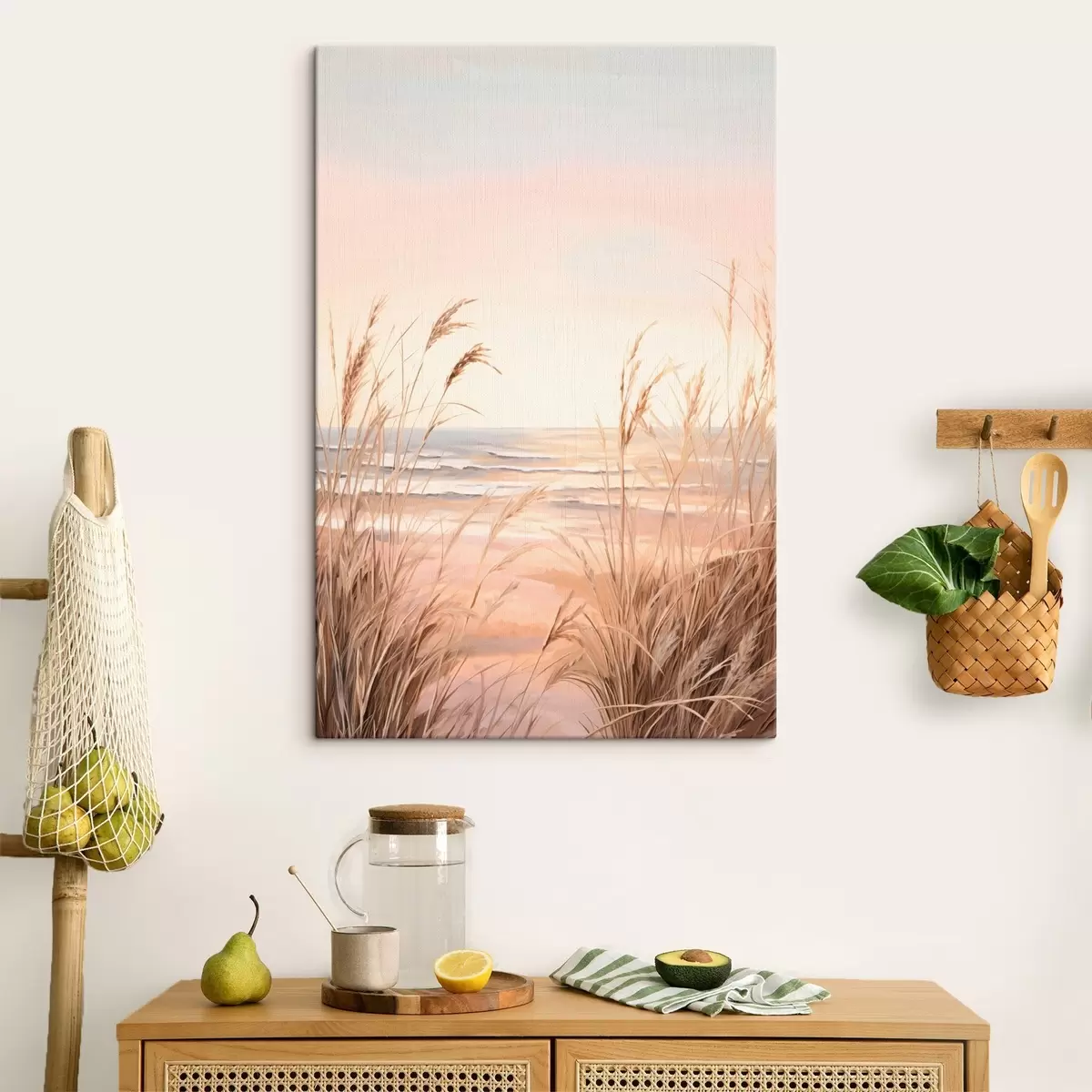 Paveikslas Pampų žolė su pastelinės oranžinės spalvos palete, šviesiai rožinis dangus, ramus kraštovaizdis Nr s45935