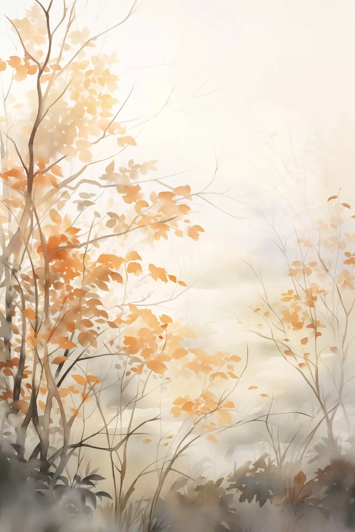 Paveikslas Rudens medžiai su oranžiniais lapais ir šakomis, švelnus akvarelės stilius, subtilūs potėpiai Nr s45941