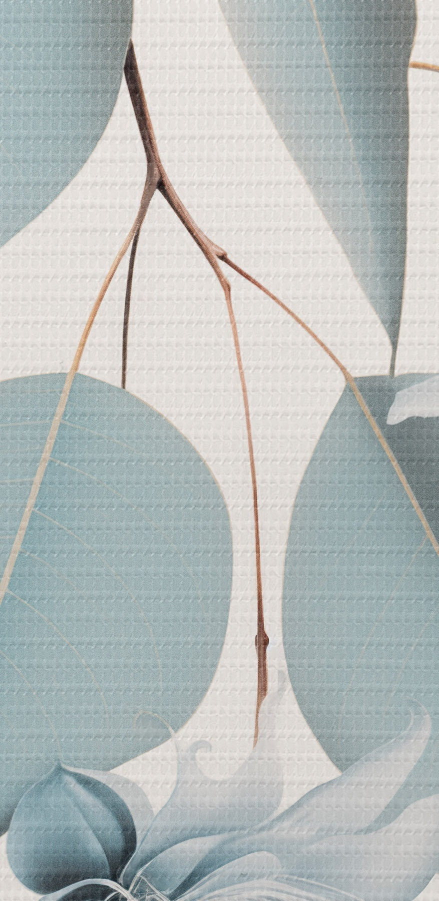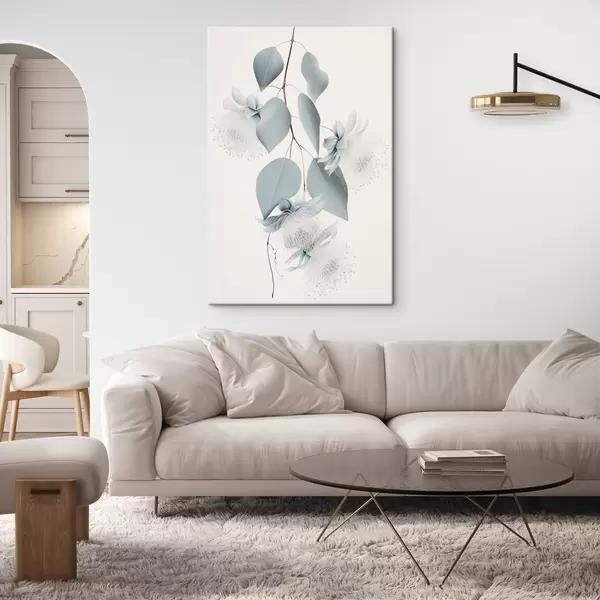 Paveikslas Eukalipto šaka su mėlynais lapais ir baltais žiedais, šviesus fonas Nr s45947