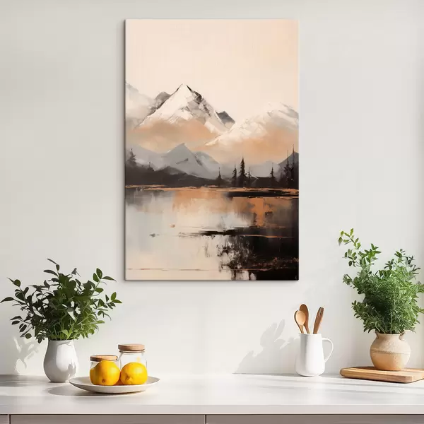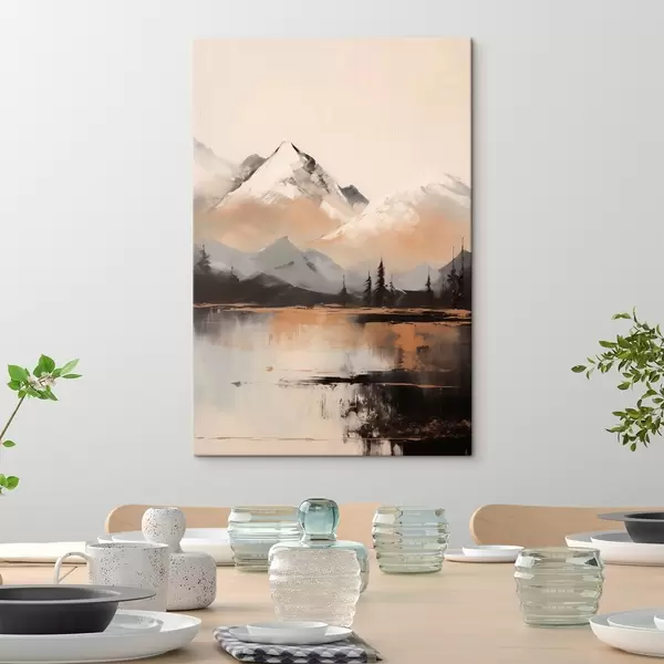 Paveikslas Snieguotos tekstūros kalnai su keliais medžiais priešais ežerą Nr s45951