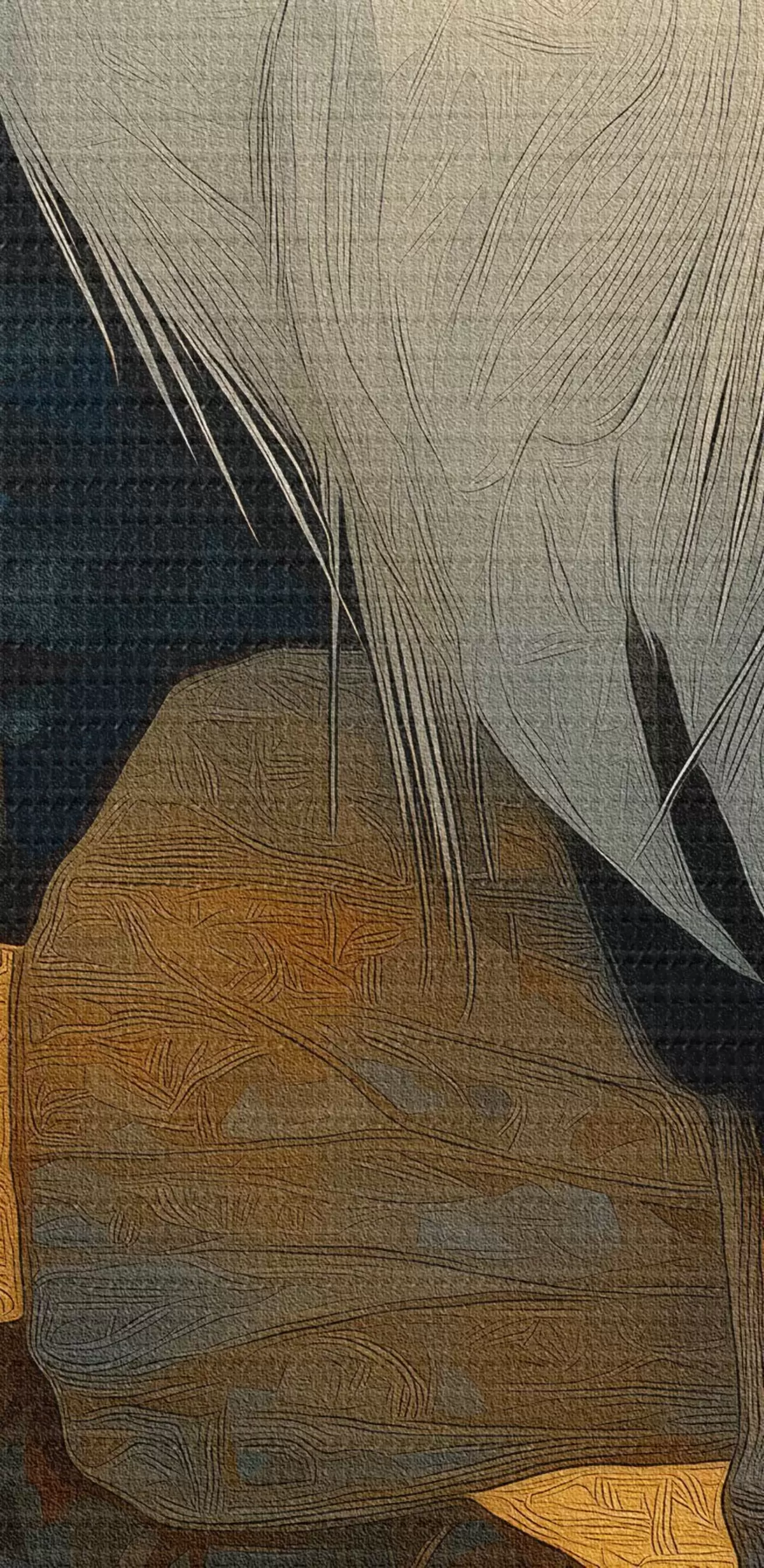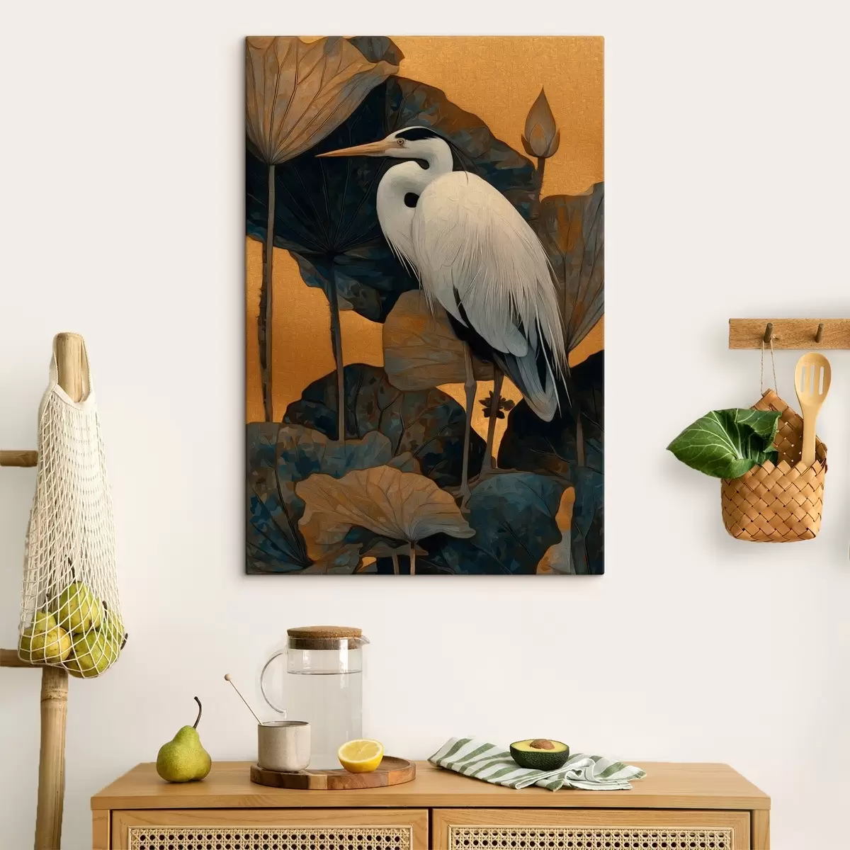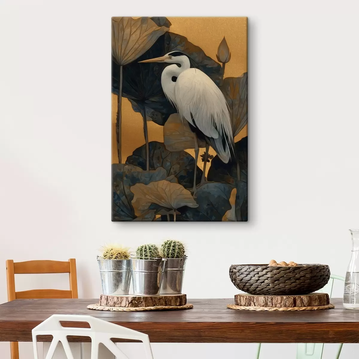 Paveikslas Balta garzė tarp didelių lapų šiltame fone Nr s46147