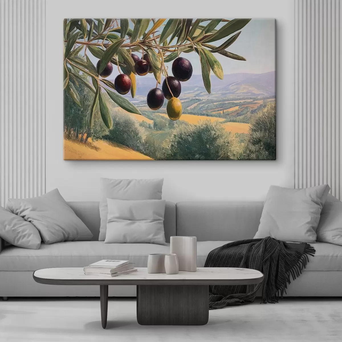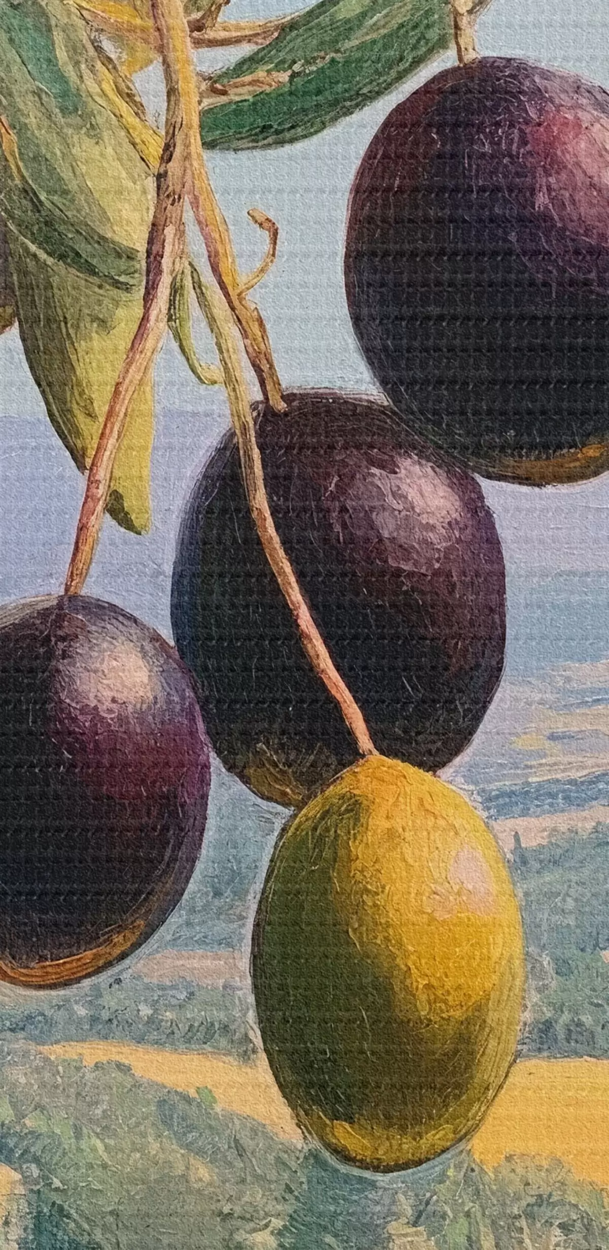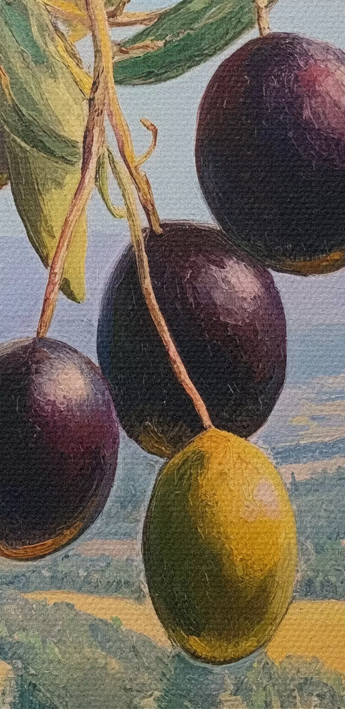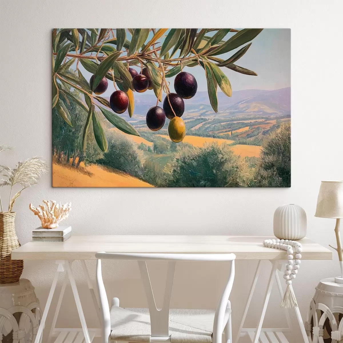 Paveikslas Alyvuogių šakelė su tamsiais vaisiais vasaros peizažo fone Nr s46150