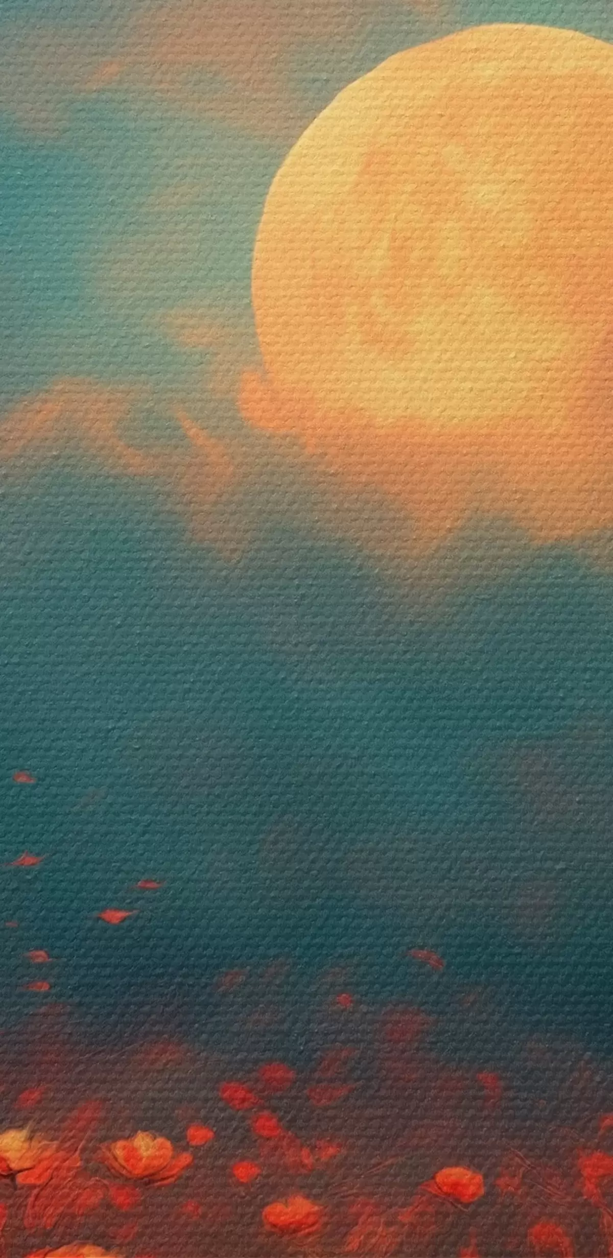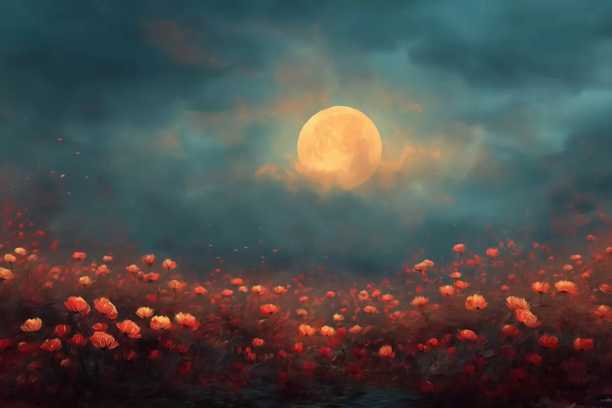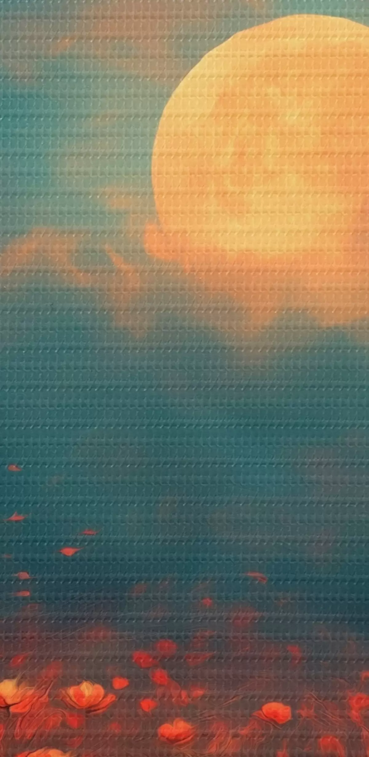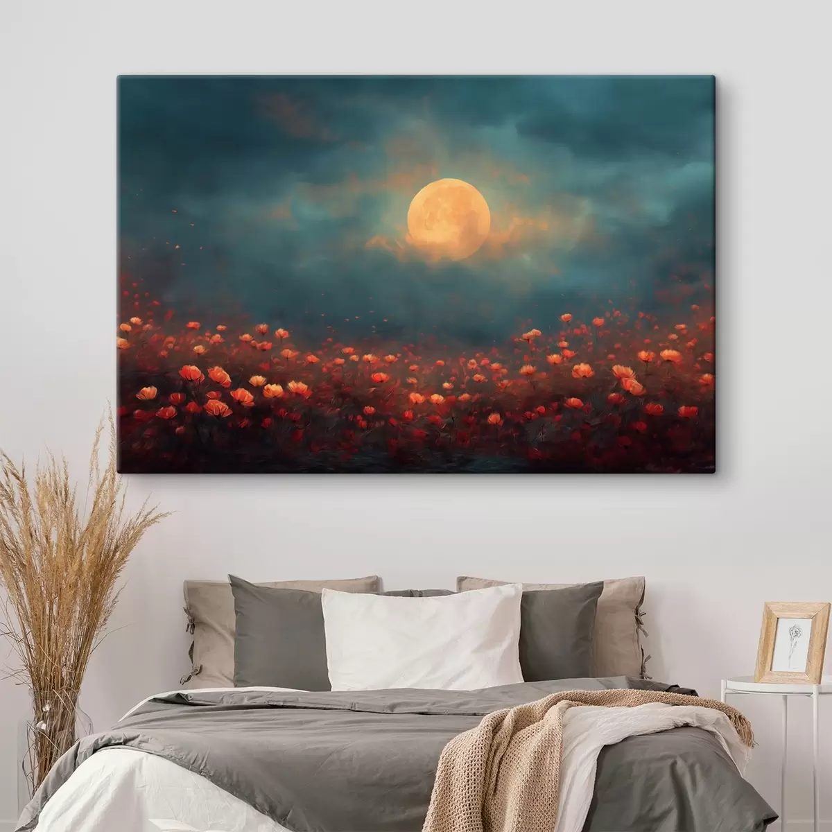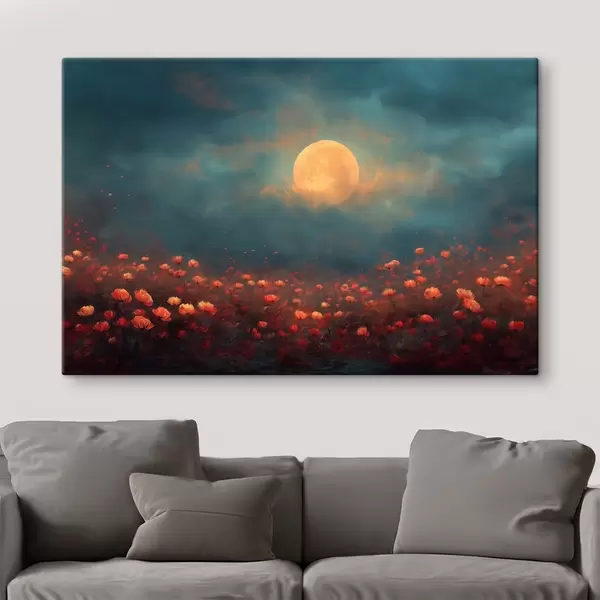Paveikslas Mėnulis virš raudonų gėlių lauko rūko apgaubtame vakaro danguje Nr s46167