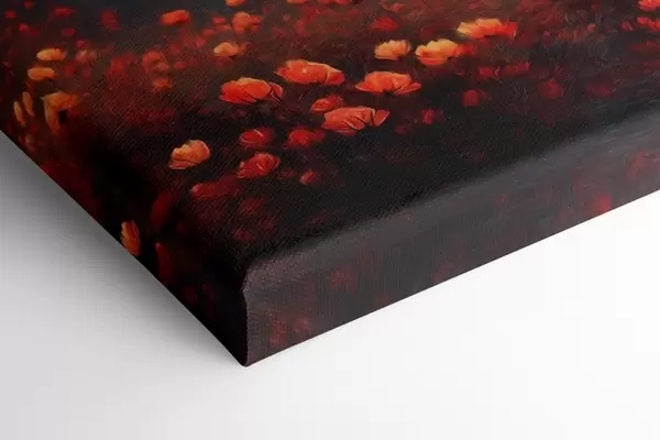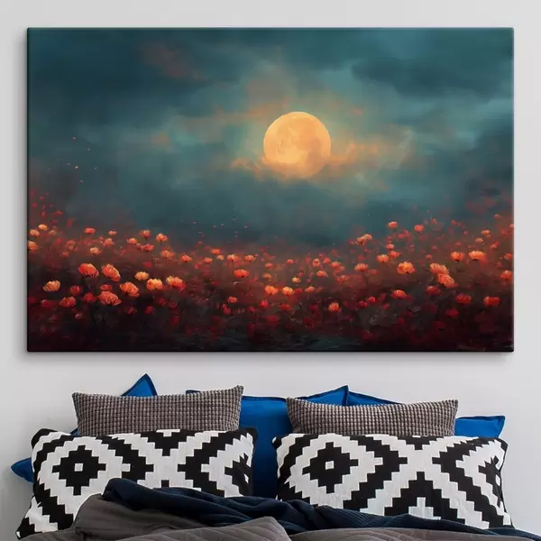 Paveikslas Mėnulis virš raudonų gėlių lauko rūko apgaubtame vakaro danguje Nr s46167