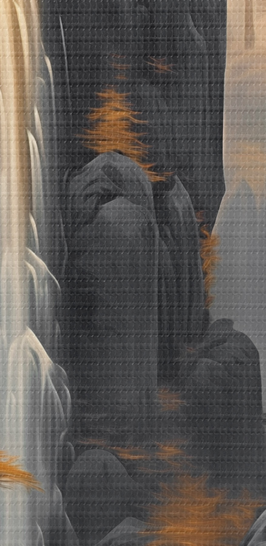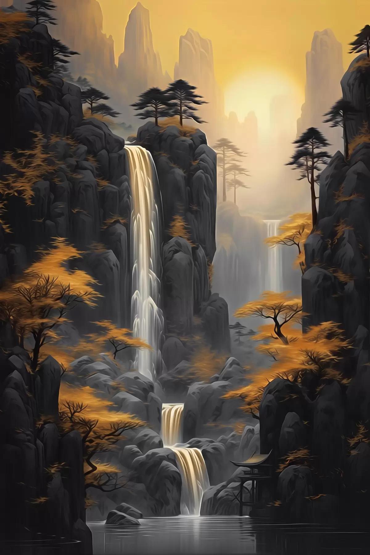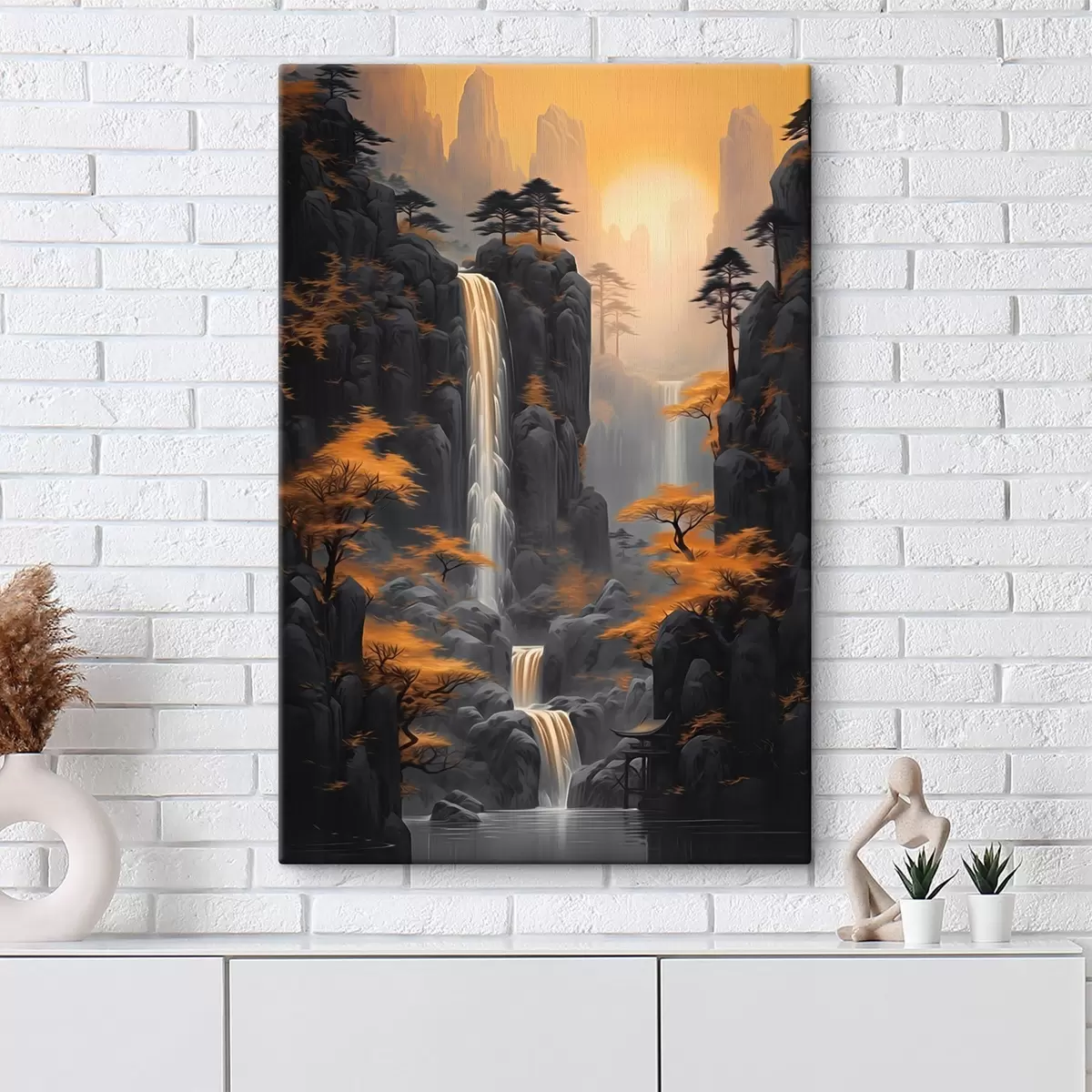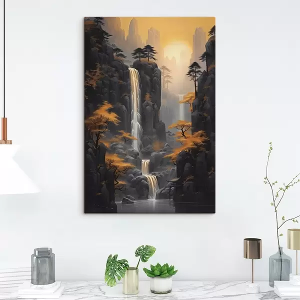 Paveikslas Uolėtas kraštovaizdis su kriokliu šiltų saulėlydžio atspalvių fone Nr s46177