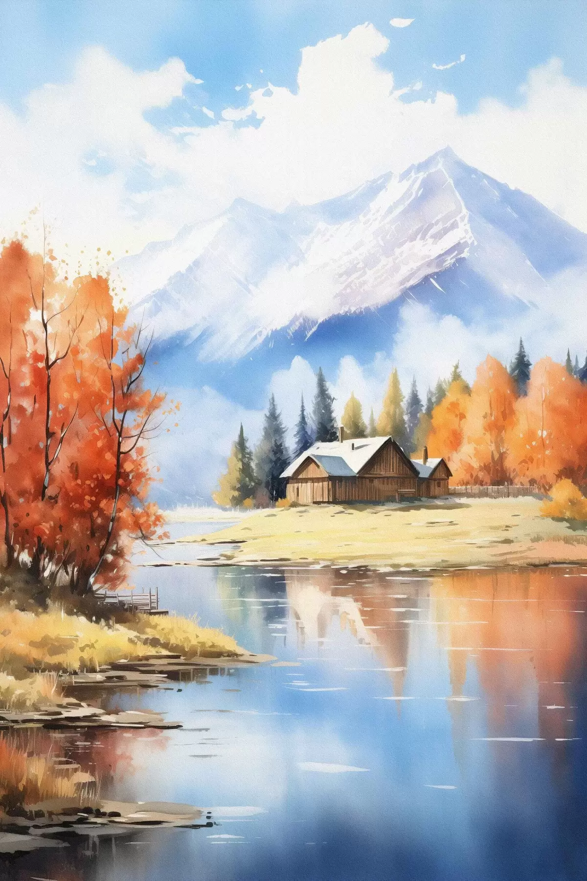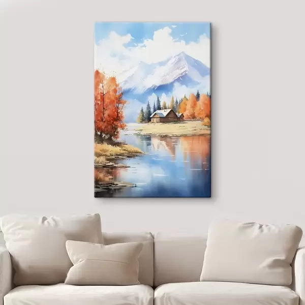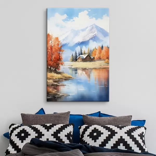 Paveikslas Rudens peizažas prie ežero su namu ir kalnais Nr s46184