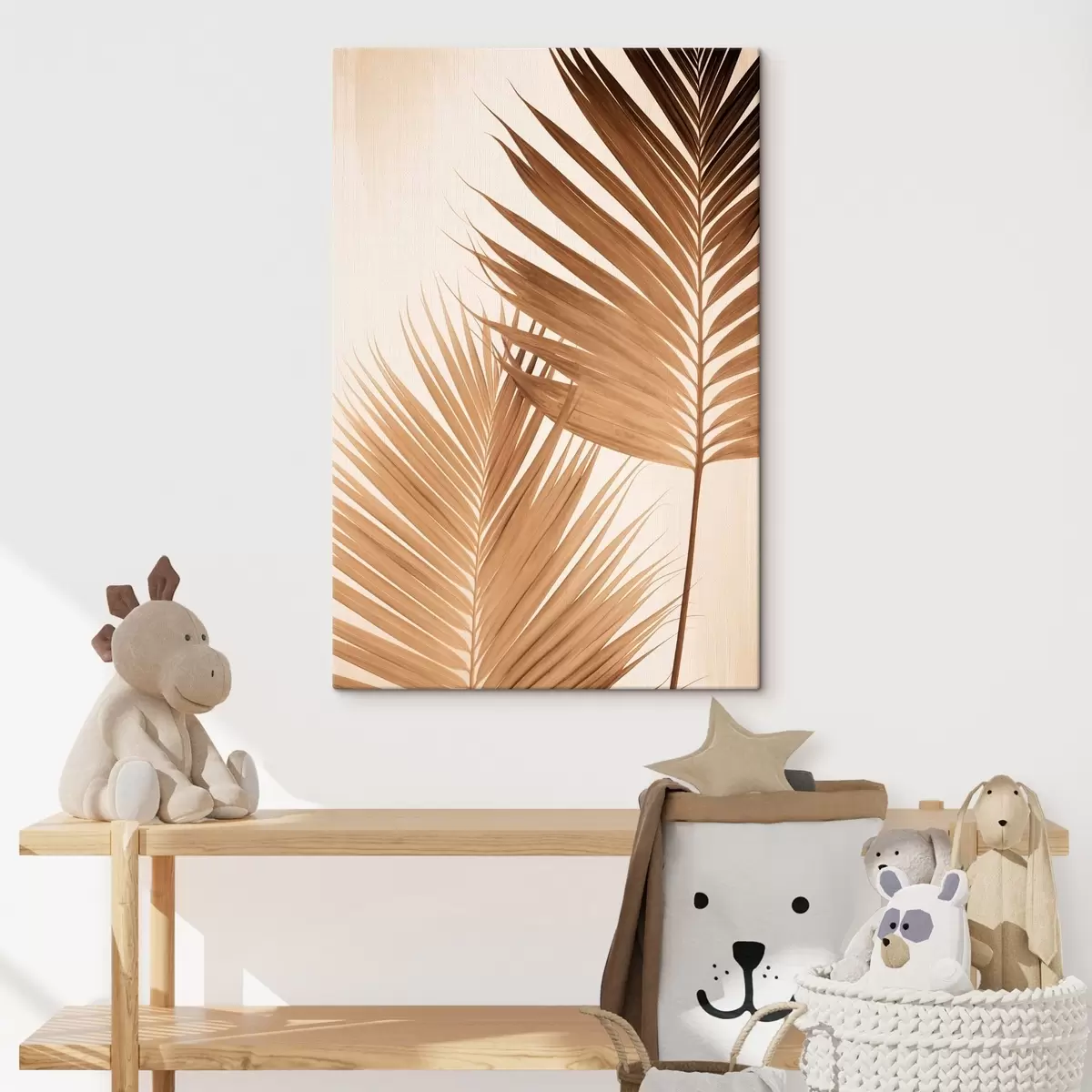 Paveikslas Rudos spalvos palmių lapai, neutralus fonas, minimalistinis stilius, natūralus apšvietimas, tropinė atmosfera Nr s46274