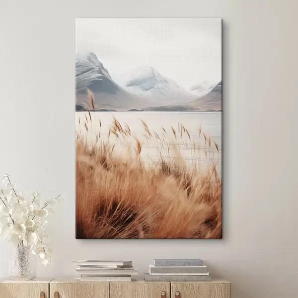 Paveikslas Pampų žolės laukas priešais ežero peizažą su snieguotomis kalnų viršūnėmis fone, švelni šviesa Nr s46282