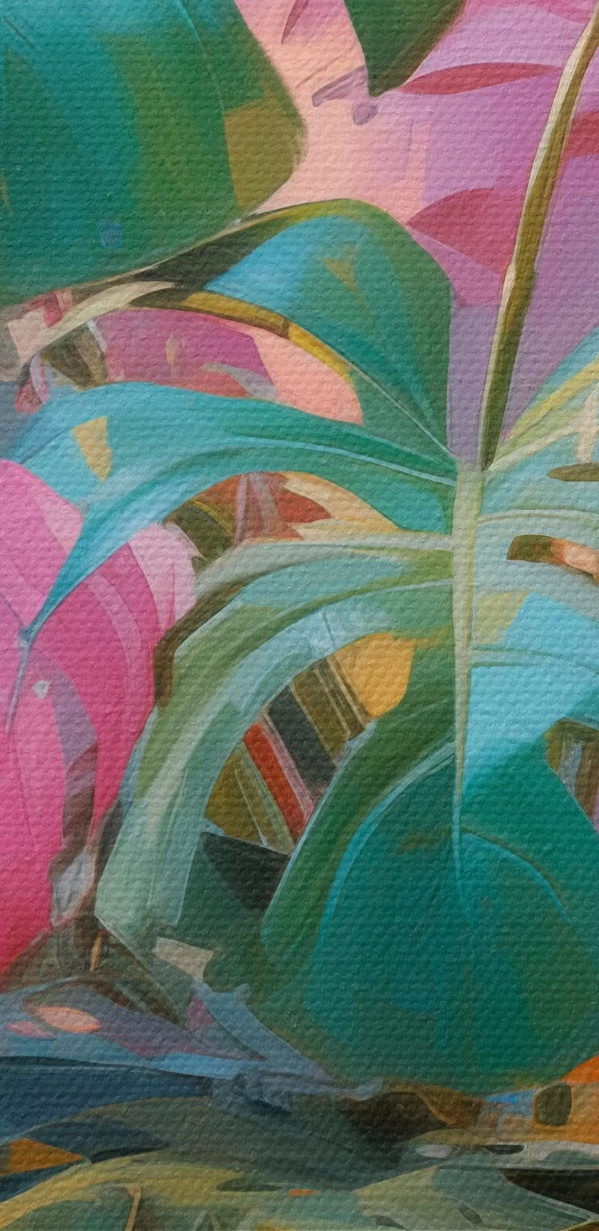 Paveikslas Abstraktaus monstera augalo su rožiniais ir žaliais lapais, ryškiomis spalvomis, prieš neryškų foną Nr s46287