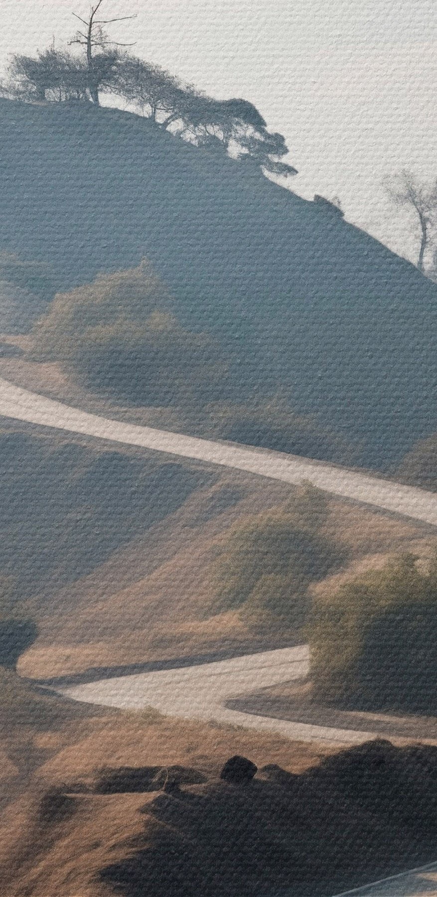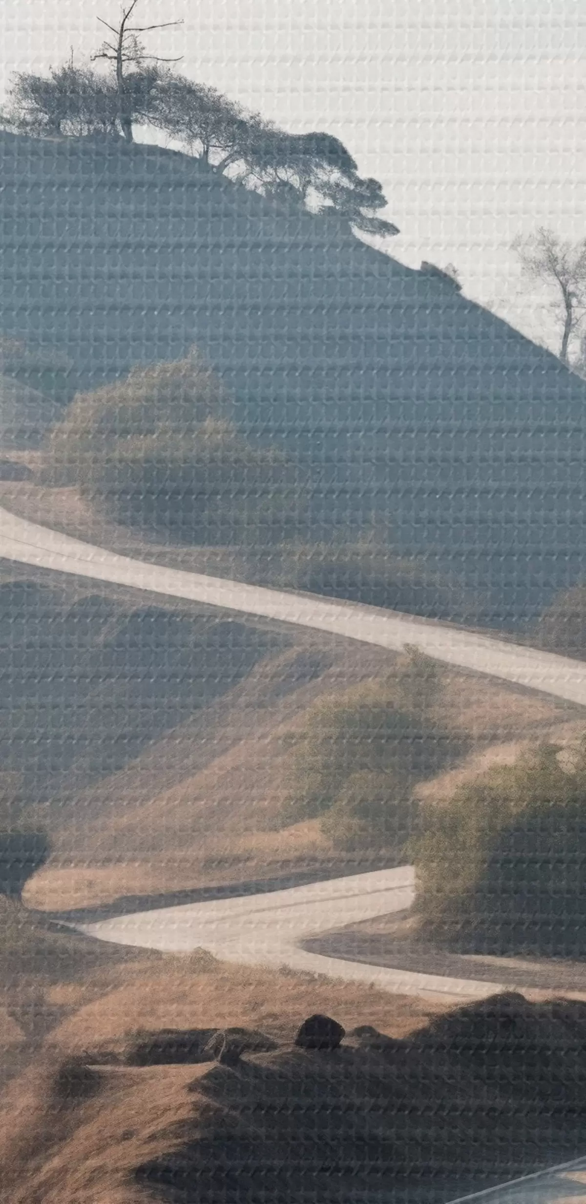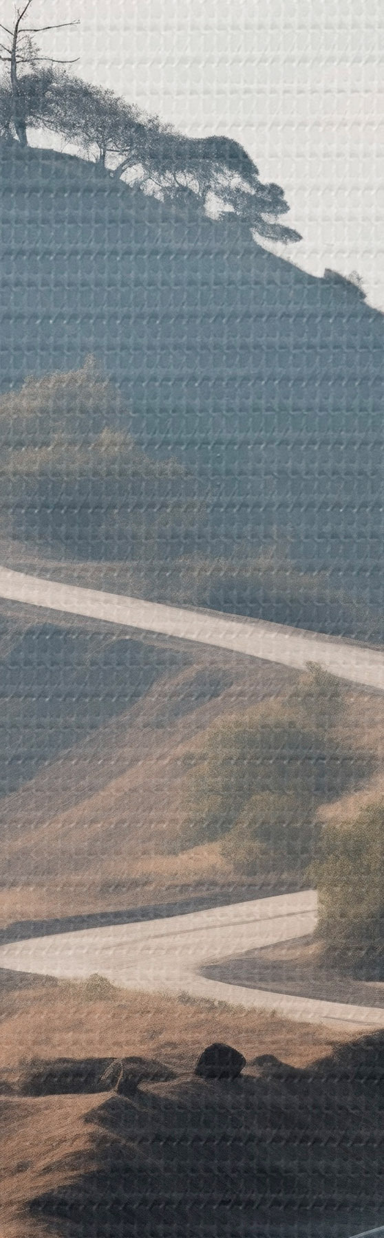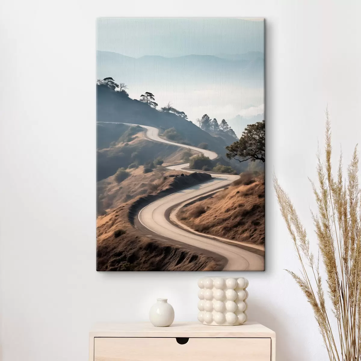 Paveikslas Vingiuotas kelias per kalvotą kraštovaizdį su sausa žole po giedru dangumi ir toli matomomis kalnų viršūnėmis. Nr s46289