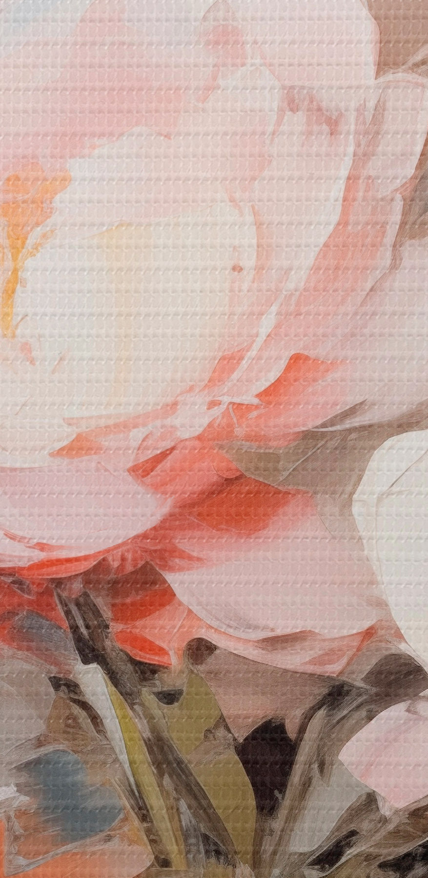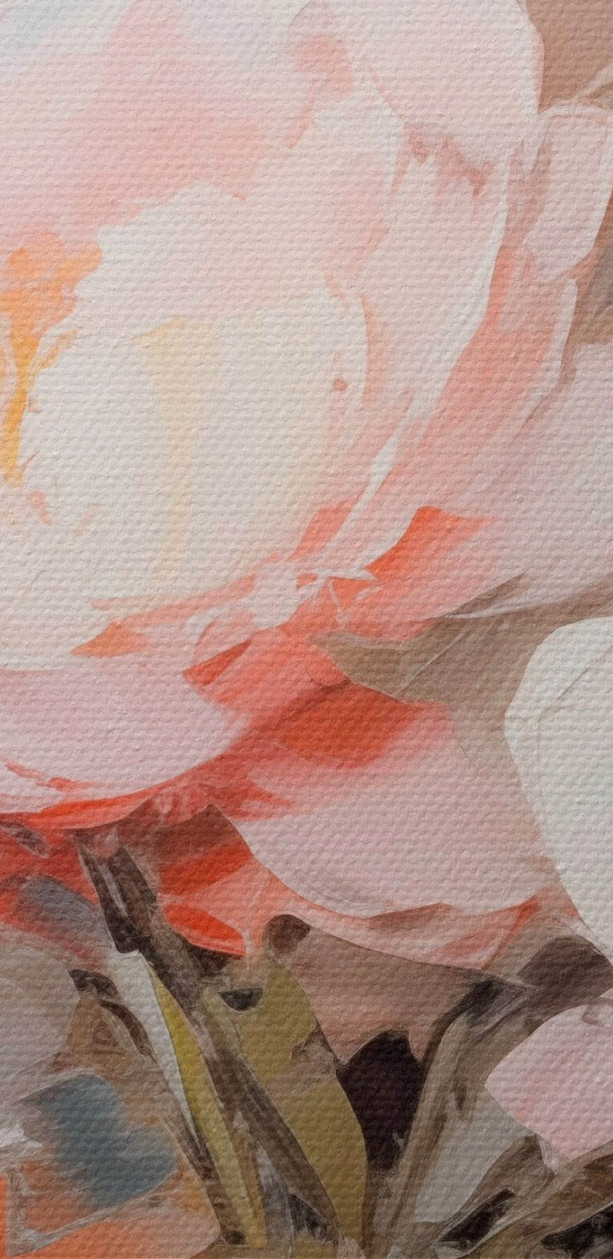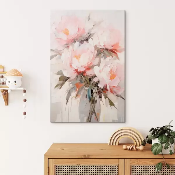 Paveikslas Rožinių ir baltų bijūnų puokštė stikliniame vazone, švelnūs potėpiai, pastelinės spalvos, neutralus fonas Nr s46295