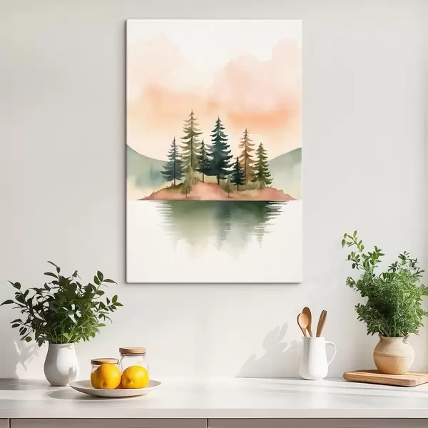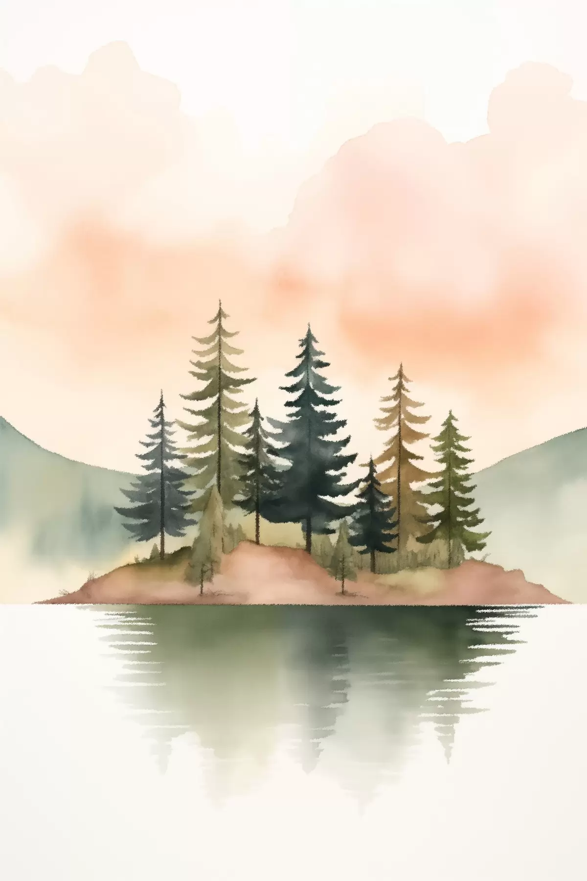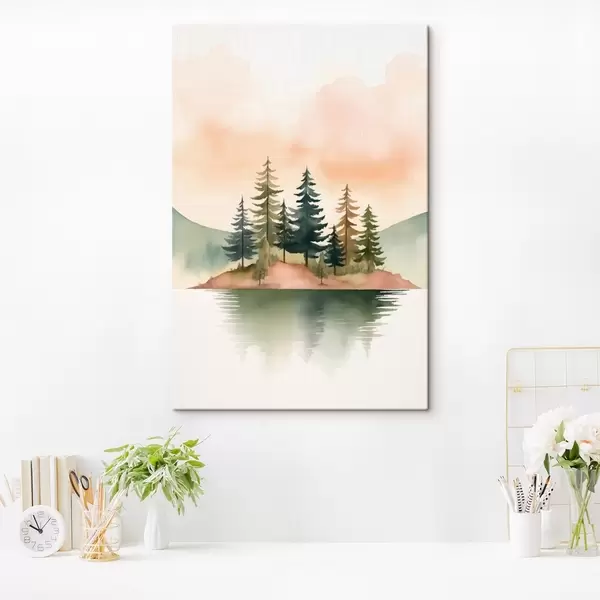 Paveikslas Akvarelinės pušys ant rūko apgaubtos salelės, švelnus persikų spalvos dangus Nr s46505