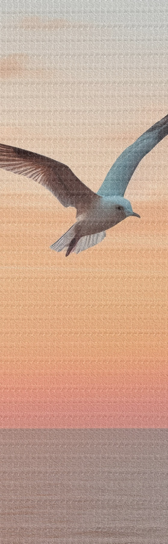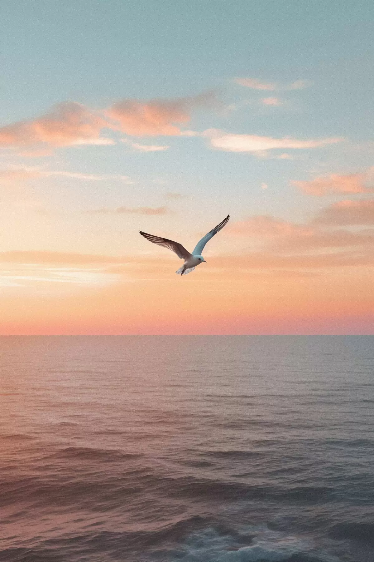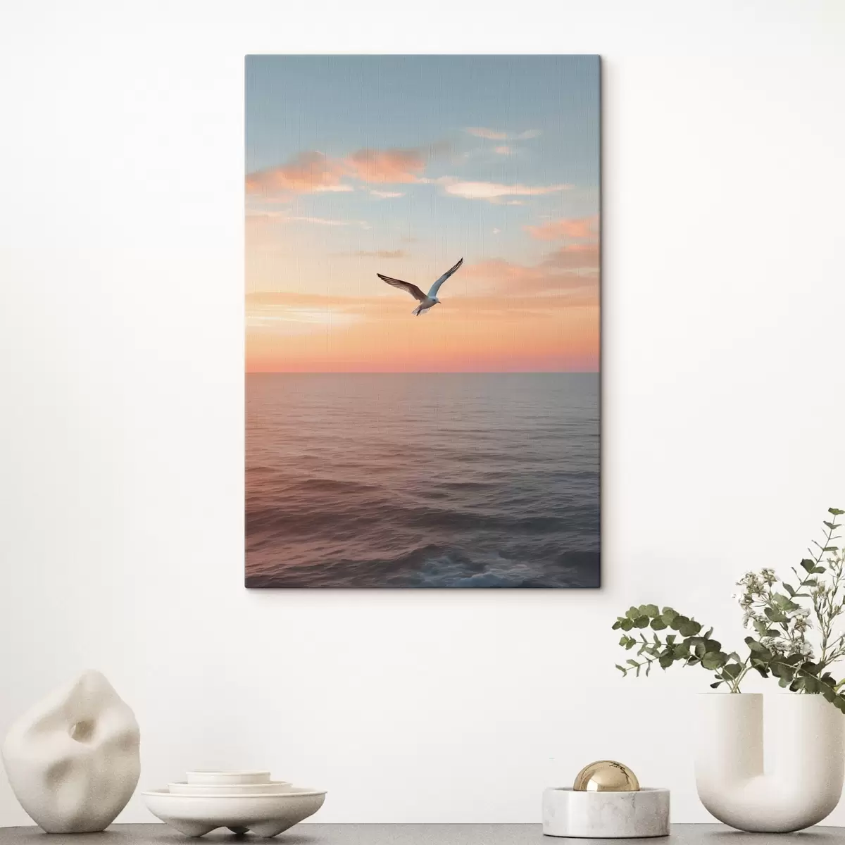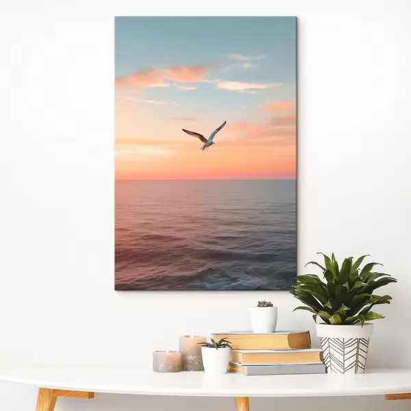 Paveikslas Jūrinis paukštis virš jūros rausvai-persikų spalvos saulėlydžio fone Nr s46520