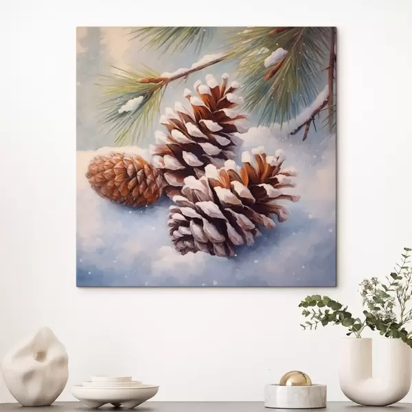 Paveikslas Sniegu padengtos pušų kankorėžės ir šakos Nr s46631