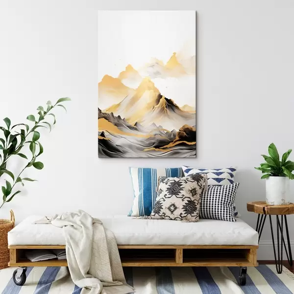 Paveikslas Tekstūruotos geltonos ir juodos kalvos su snieguotomis viršūnėmis, tapybos stilius „ink wash“, minimalistinis kalnų masyvas Nr s46684