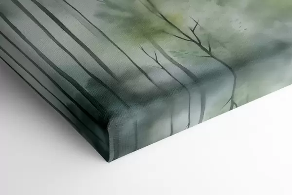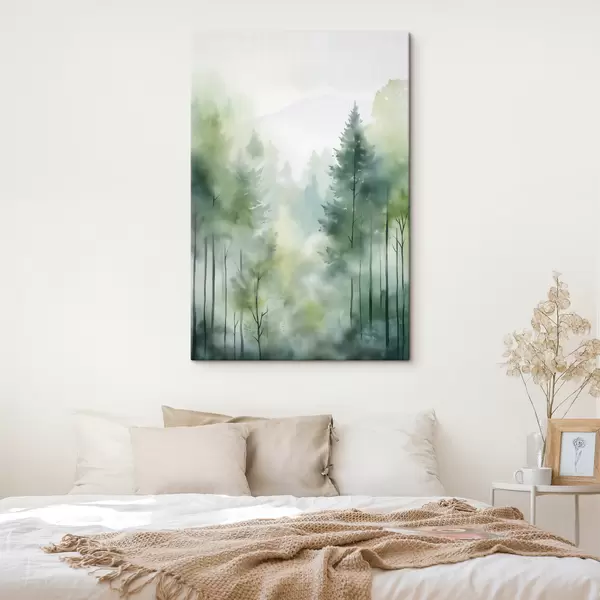 Paveikslas Akrilo tapyba, imituojanti rūko apgaubtą mišką su aukštomis pušimis ir kalnais fone Nr s46690