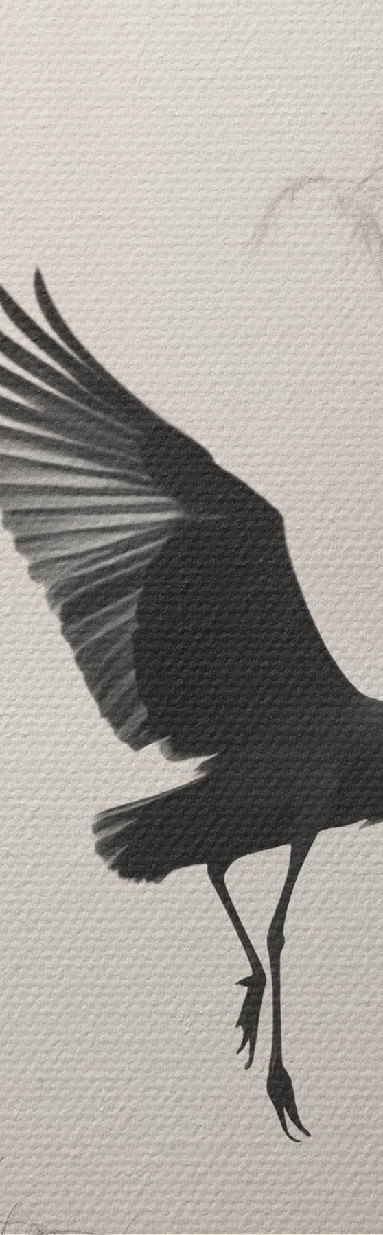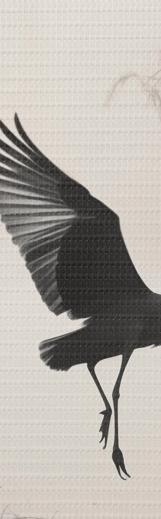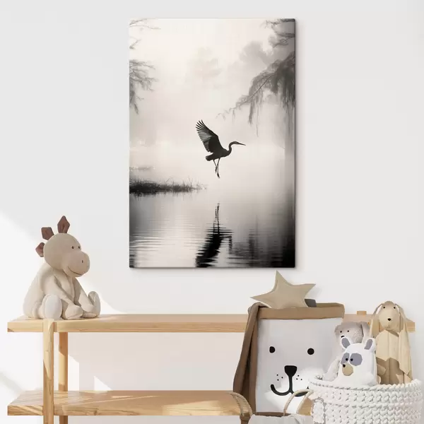 Paveikslas Balta garza su išskleistais sparnais, skraidanti šalia aukštų nendrių, juodos ir baltos spalvų minimalistinė kompozicija Nr s46694