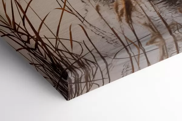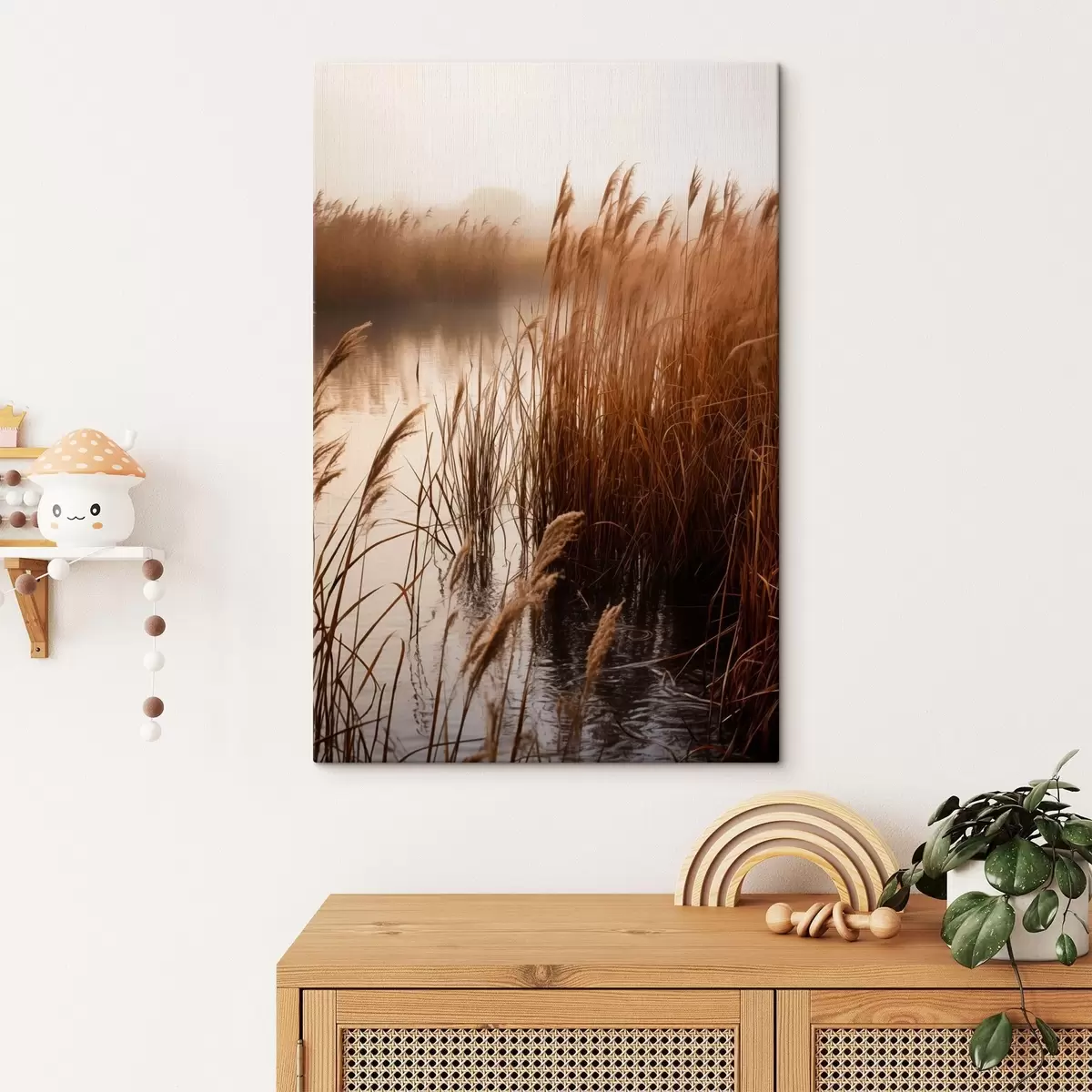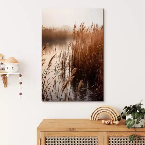Paveikslas Aukšti nendrės, augančios vandens telkinyje, vanduo atspindi nendres, rūko apgaubtas fonas, švelni šviesa, gamtos vaizdas Nr s46695