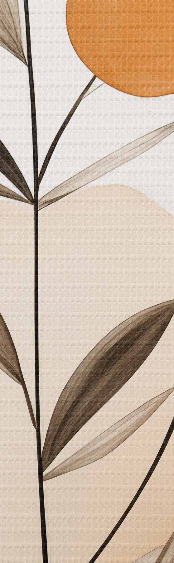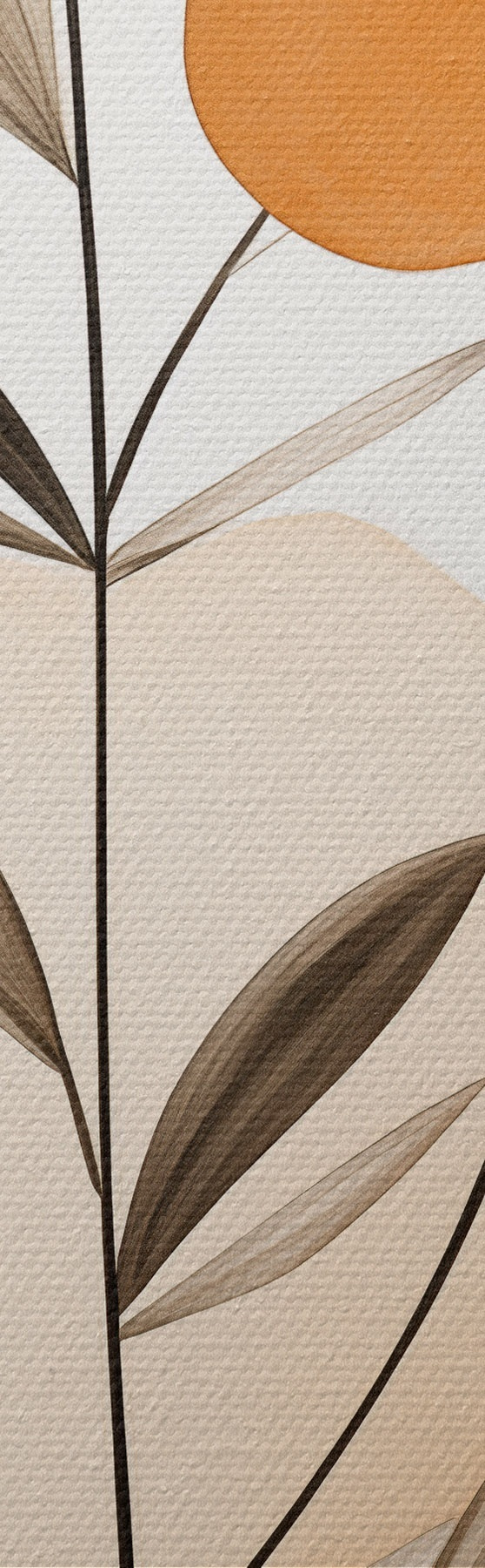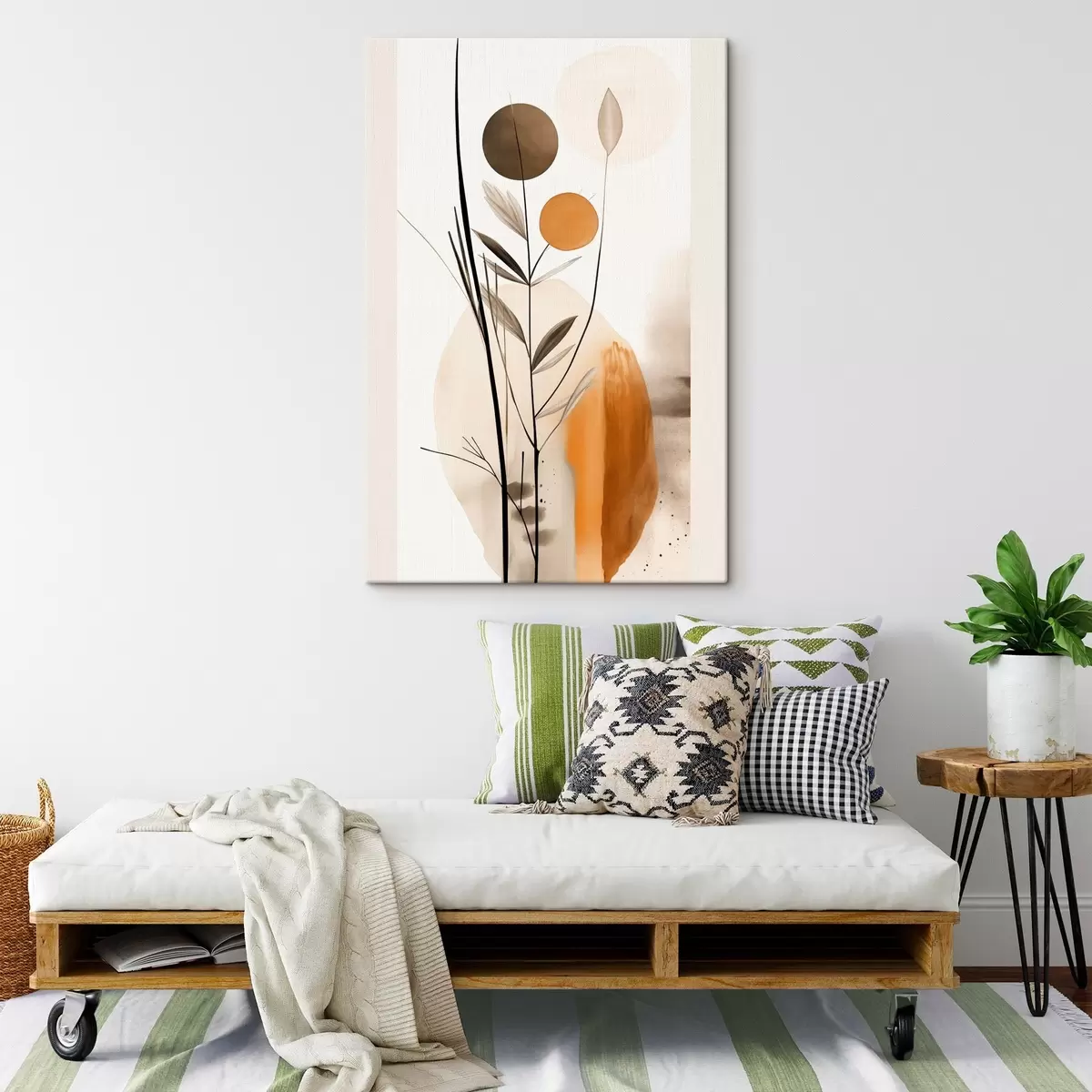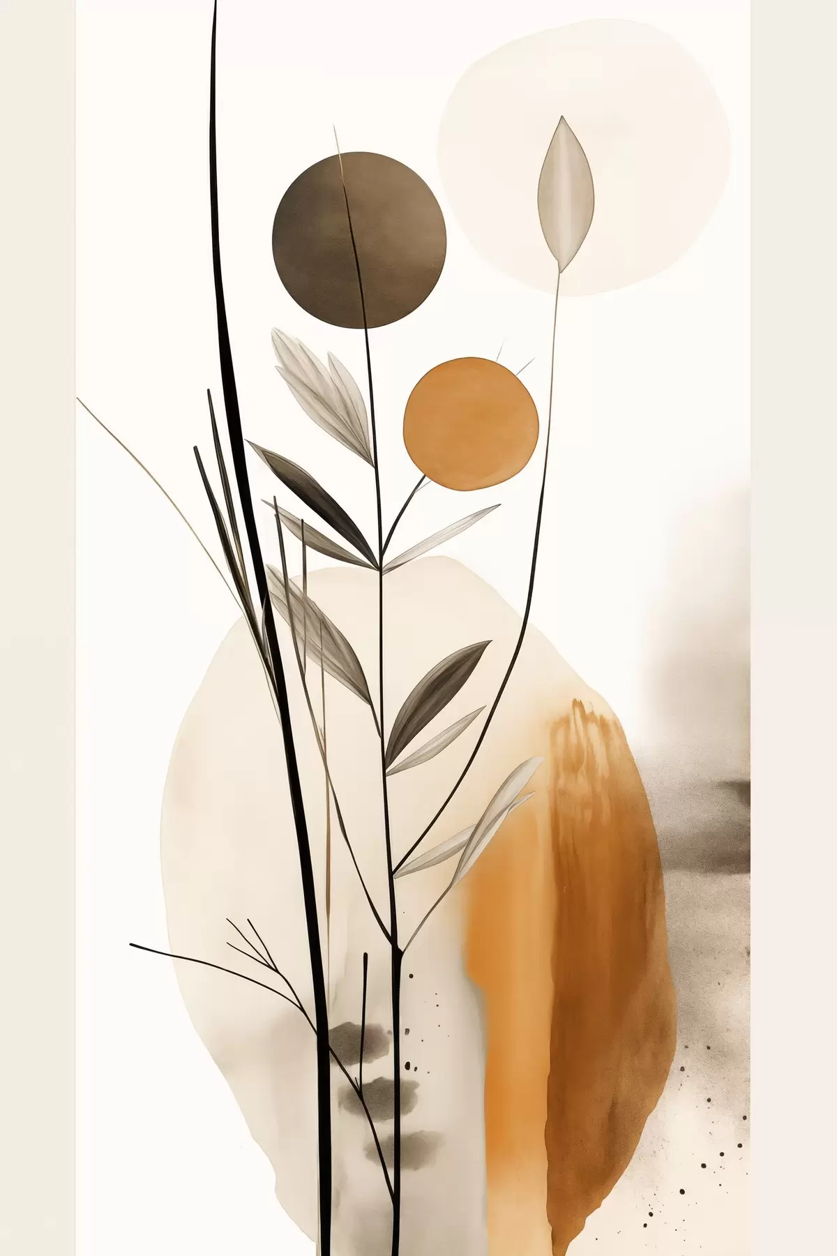 Paveikslas Abstraktaus tapybos imitacija su oranžiniais ir pilkais apskritimais, lapais ir šakomis, modernus stilius, akvarelės efektas Nr s46698