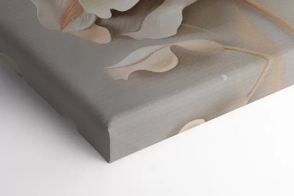 Paveikslas Balta gėlė, švelnių atspalvių žiedlapiai, šviesiai smėlio spalvos fonas, elegantiška kompozicija, minimalistinis stilius Nr s46699