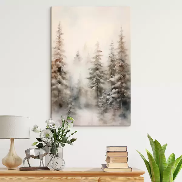 Paveikslas Aukštos pušys, padengtos sniegu, stovinčios rūko apgaubtame miške, švelnus, tylus žiemos peizažas. Nr s46701