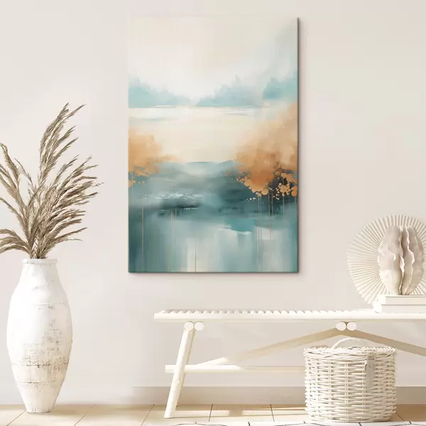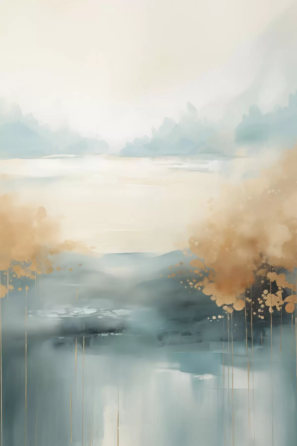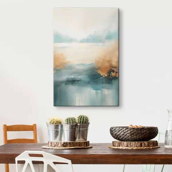 Paveikslas Abstraktus peizažas su kalnais ir ežeru žalios ir tekstūruotos geltonos spalvos, švelniais potėpiais, minimalistinis meno kūrinys Nr s46704