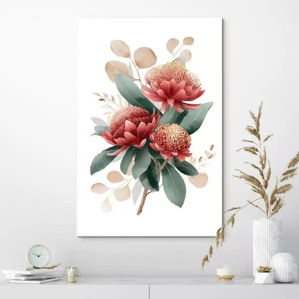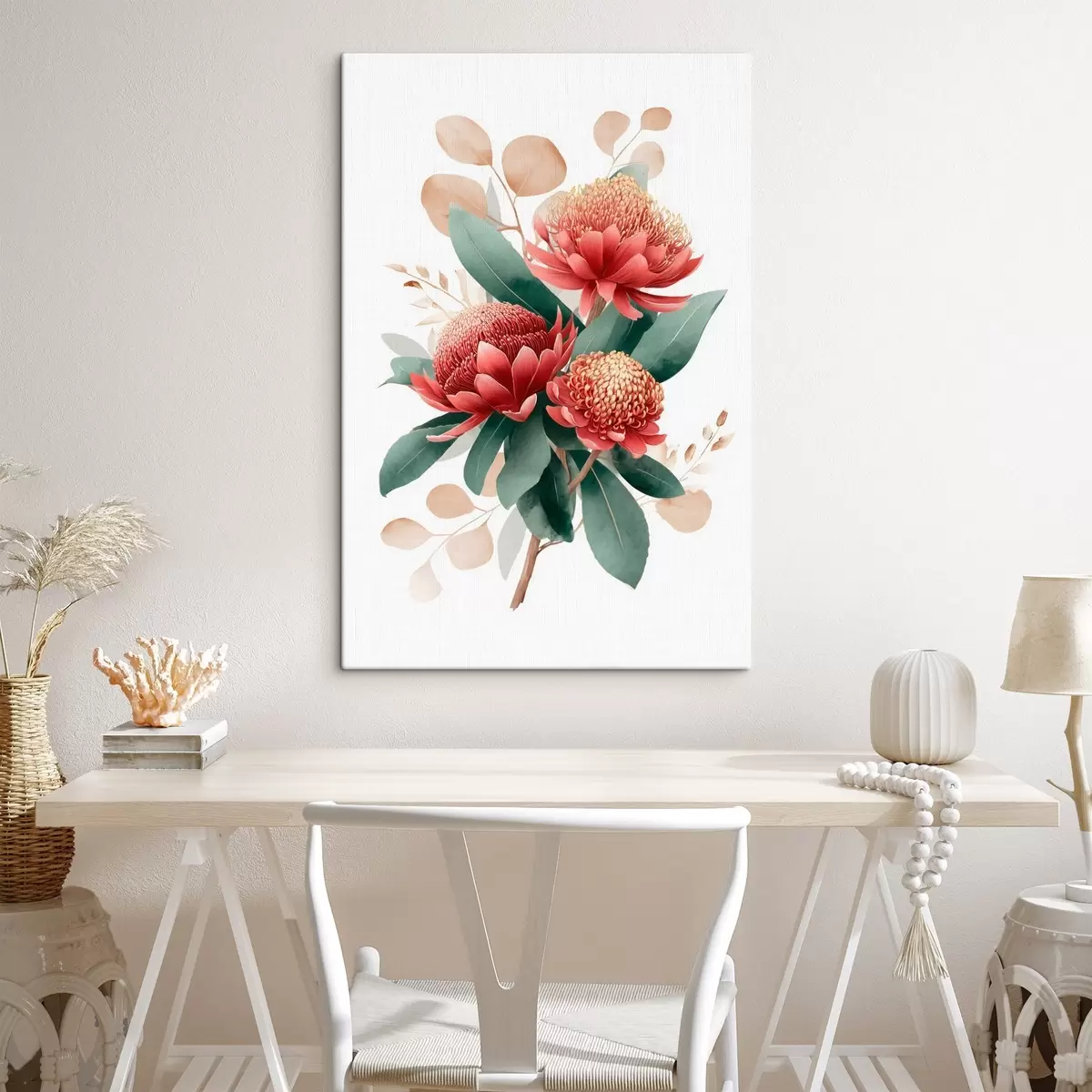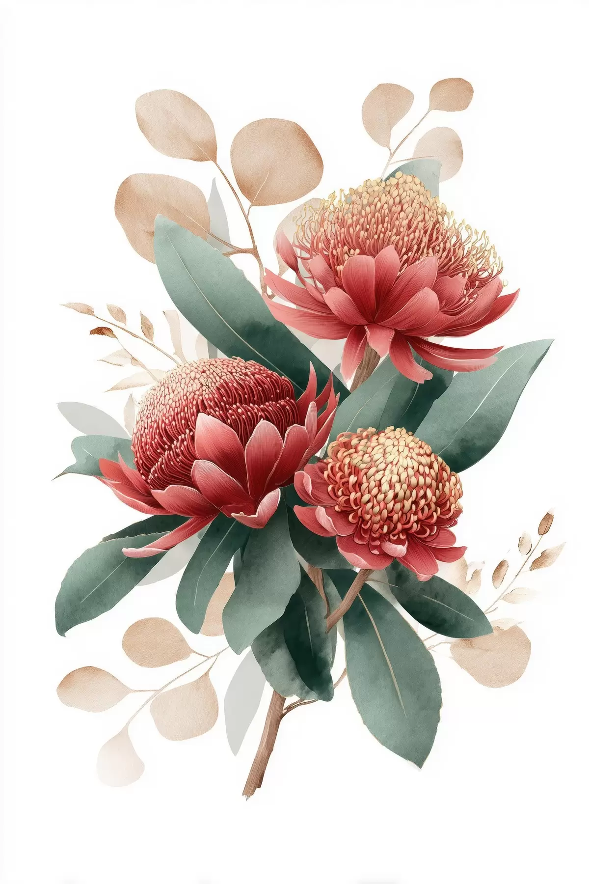Paveikslas Išraiškingas proteų ir dekoratyvinių lapų puokštė, sukurtas moderniosios meno iliustracijos stiliumi. Nr s46954