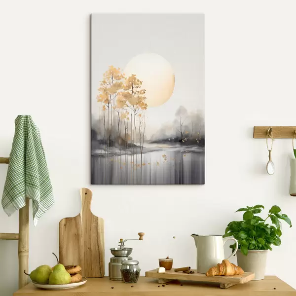 Paveikslas Dekoratyvus abstraktus peizažas, aukšti medžiai su geltonais lapais, upė ir rūkas fone Nr s47014