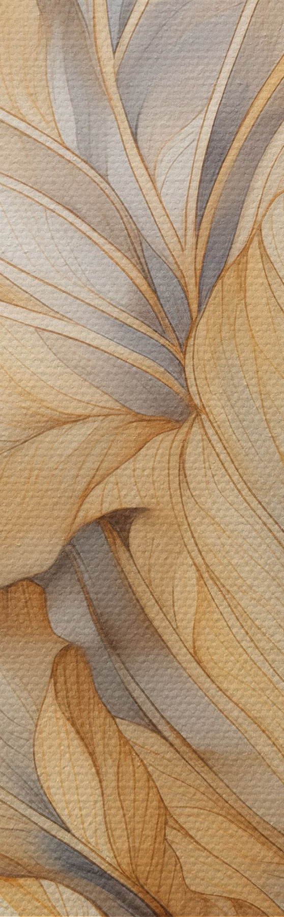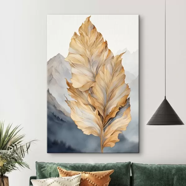 Paveikslas Abstrakčios didelės, geltonos ir rudos spalvos lapai su sudėtingais detalėmis, kalnų peizažo fone Nr s47022