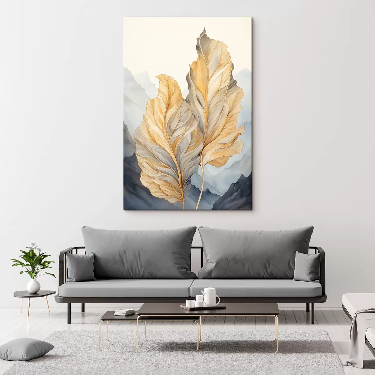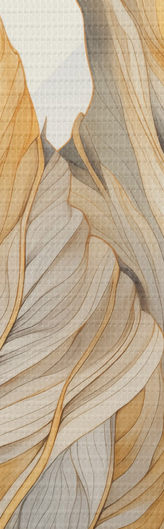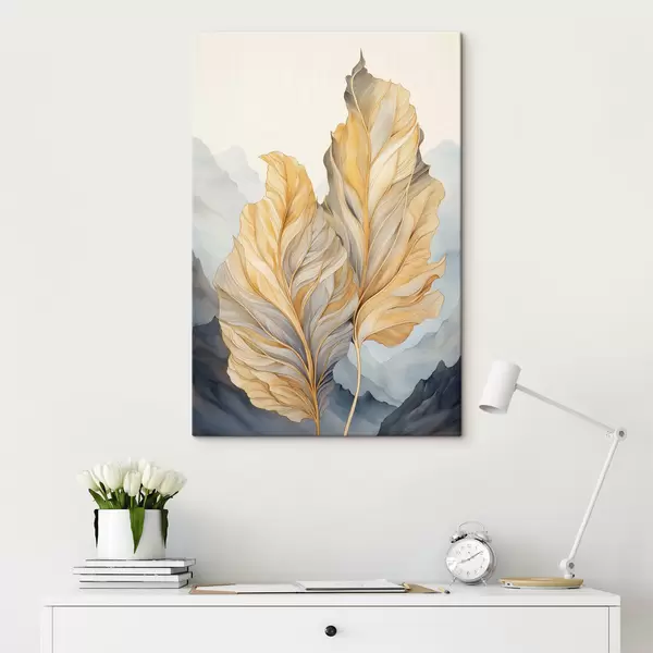 Paveikslas Abstrakčios didelės, geltonos ir rudos spalvos lapai su sudėtingais detalėmis, kalnų peizažo fone Nr s47023