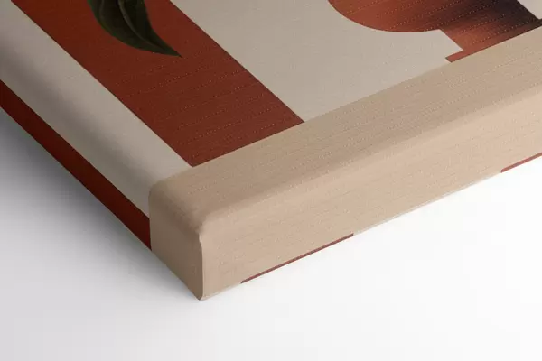 Paveikslas Abstraktus vazoninis augalas su dideliais žaliais ir smėlio spalvos lapais priešais kreminės spalvos arką su terakotos akcentu Nr s47032