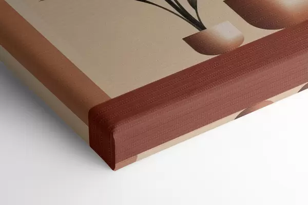 Paveikslas Abstrakčios vazoninės gėlės su dideliais žaliais ir raudonais lapais priešais kreminės spalvos arką Nr s47033