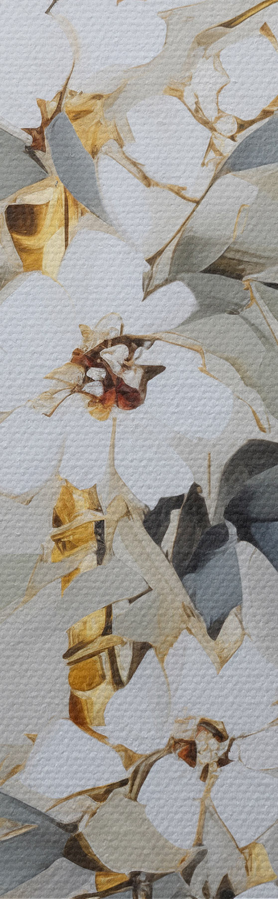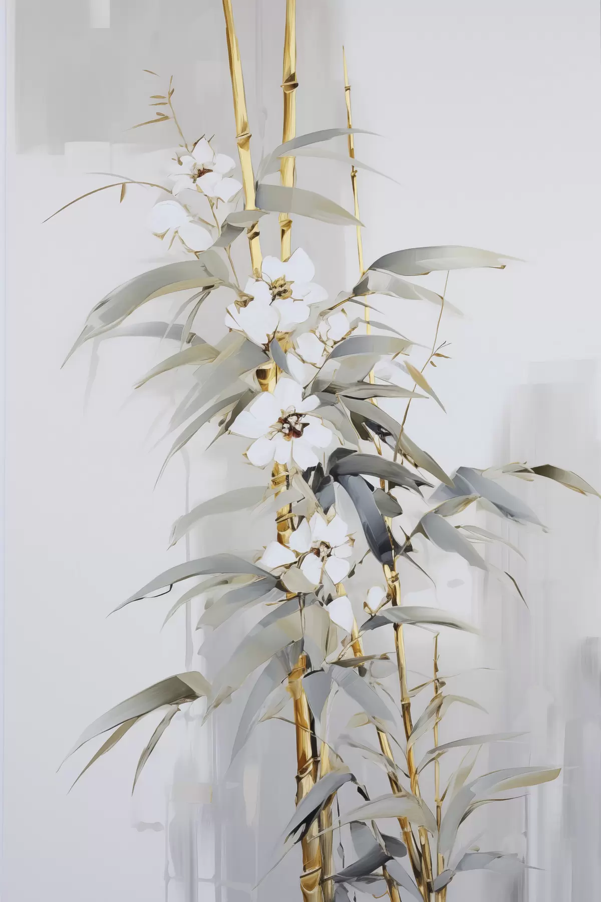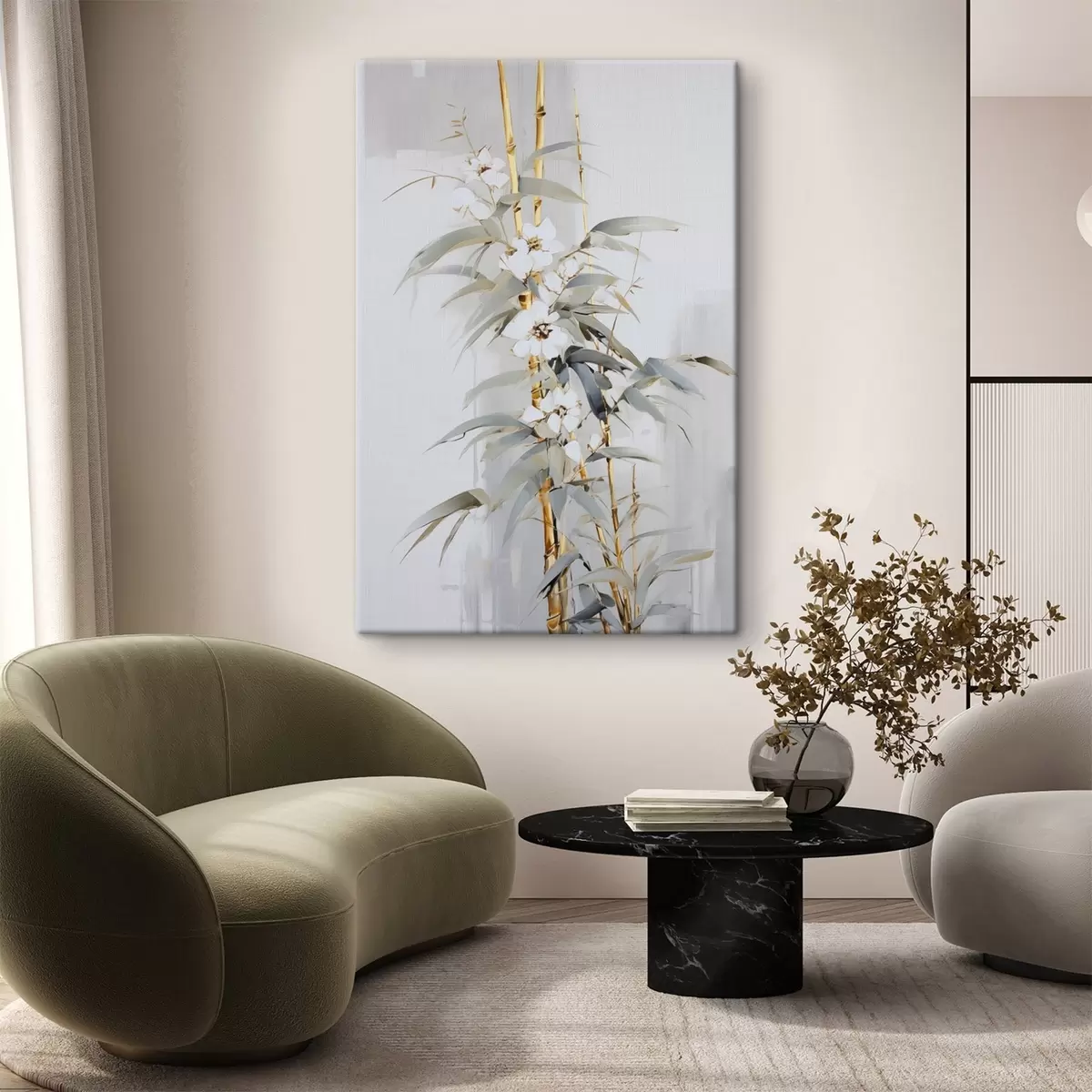 Paveikslas Abstrakčios bambuko stiebai su geltonais akcentais, subtiliais baltais žiedais ir šviesiai žaliais lapais, pilkas fonas Nr s47039