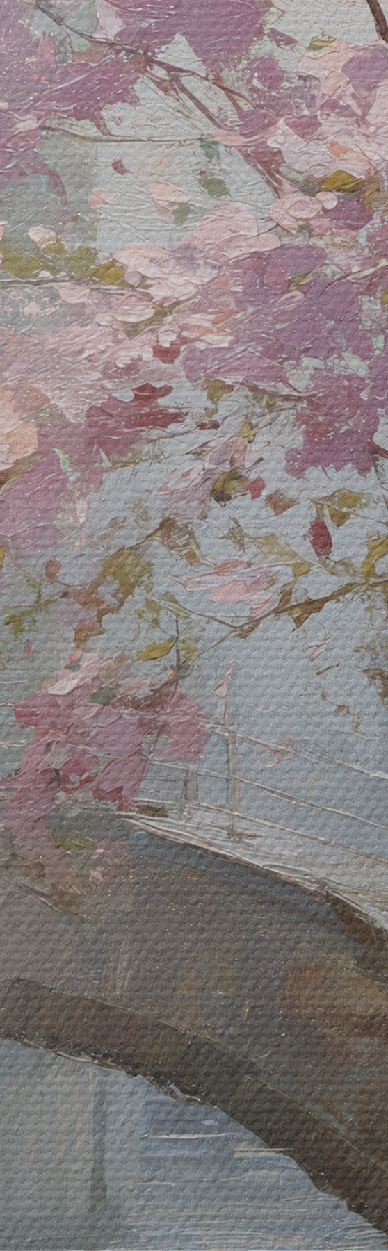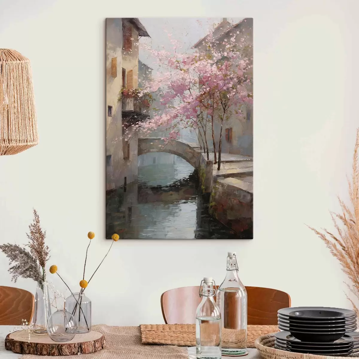 Paveikslas romantiškas miesto peizažas su žydinčiu medžiu aliejaus tapybos stiliumi Nr s47127
