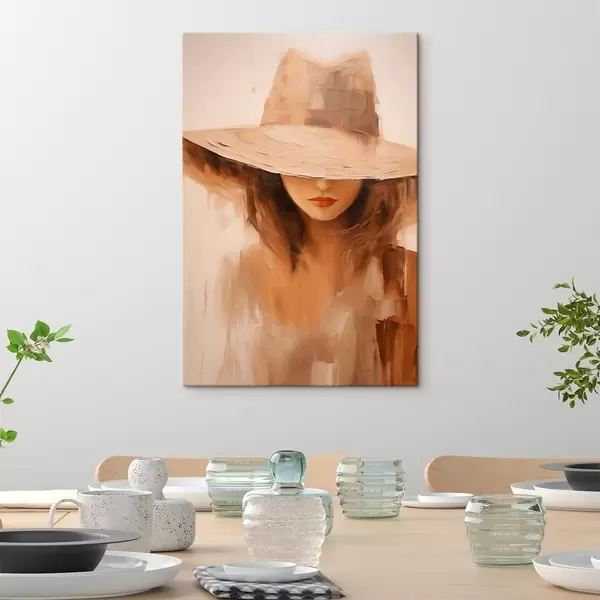 Paveikslas Moteris su skrybėle, nutapyta šiltais abstrakčiais potėpiais Nr s47312