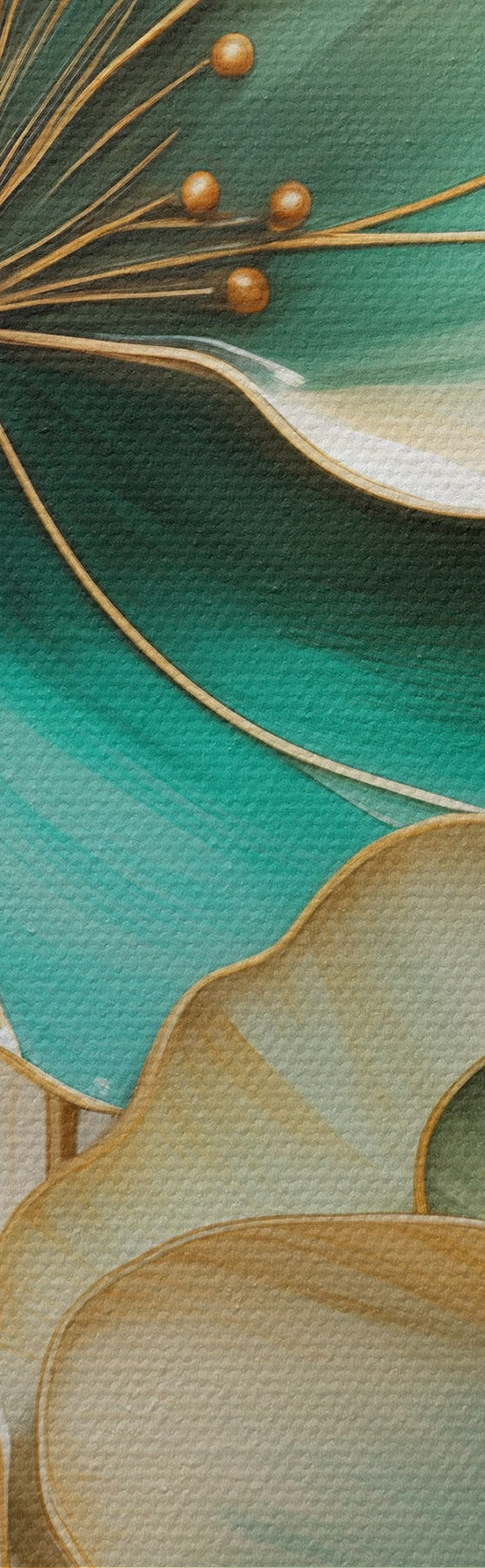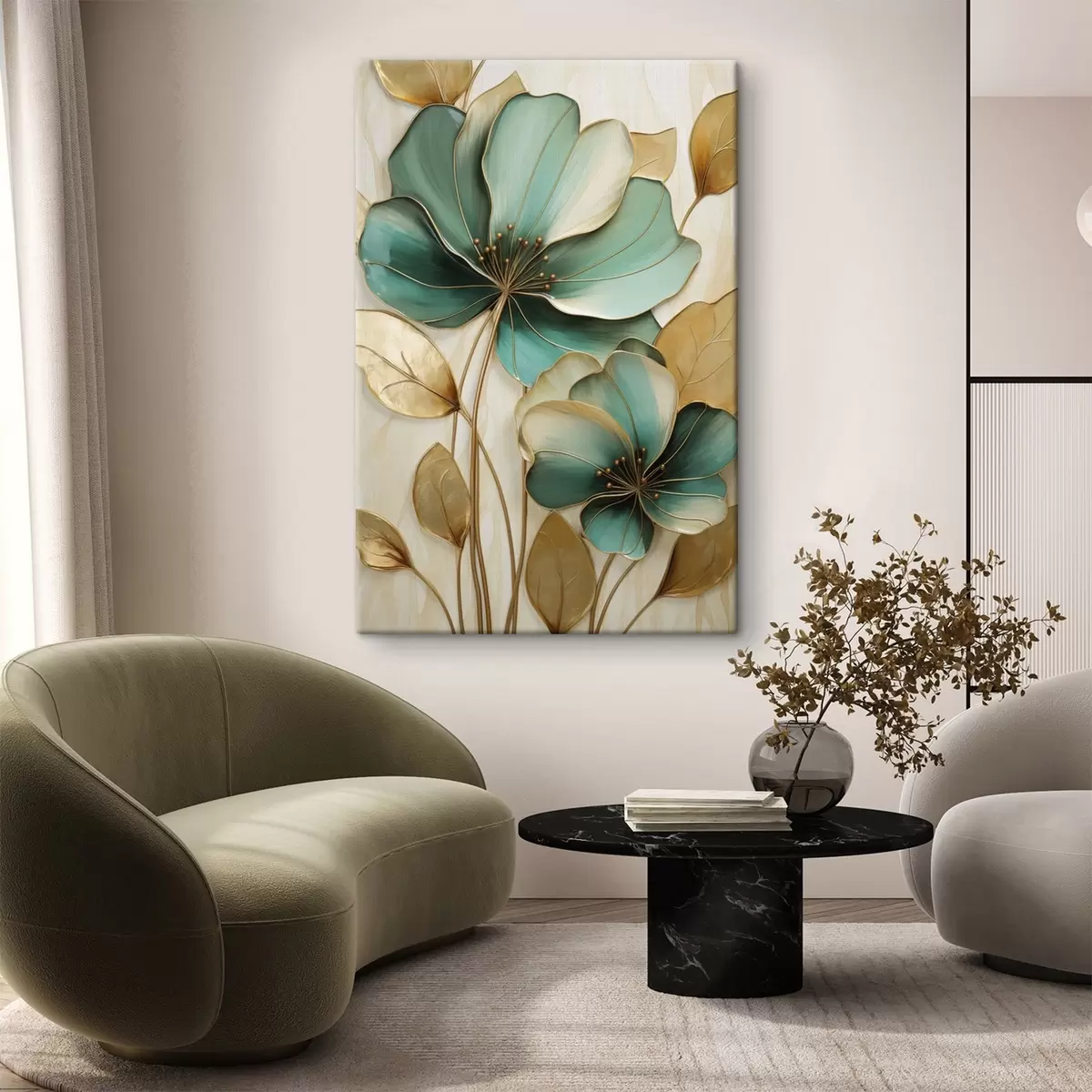 Paveikslas Didelės žalios ir geltonos gėlės su kontūrais, apsuptos geltonų lapų ant abstraktaus fono Nr s47418