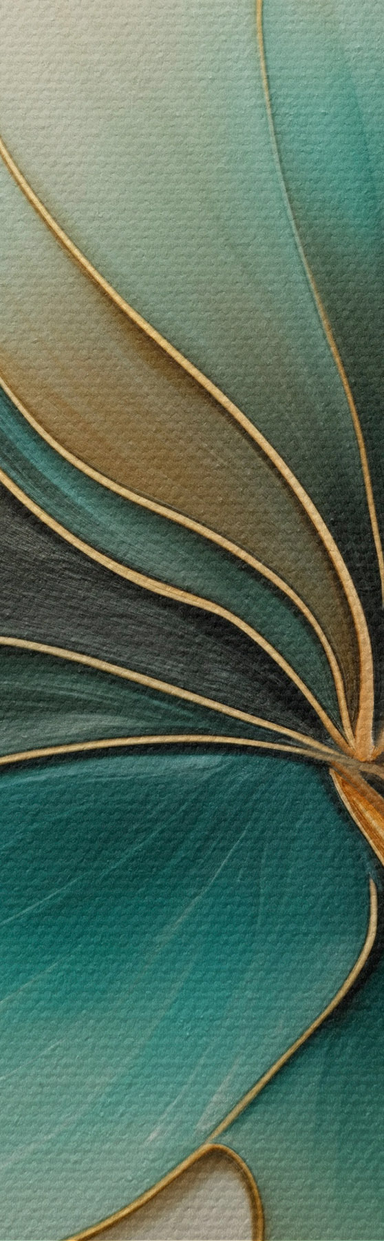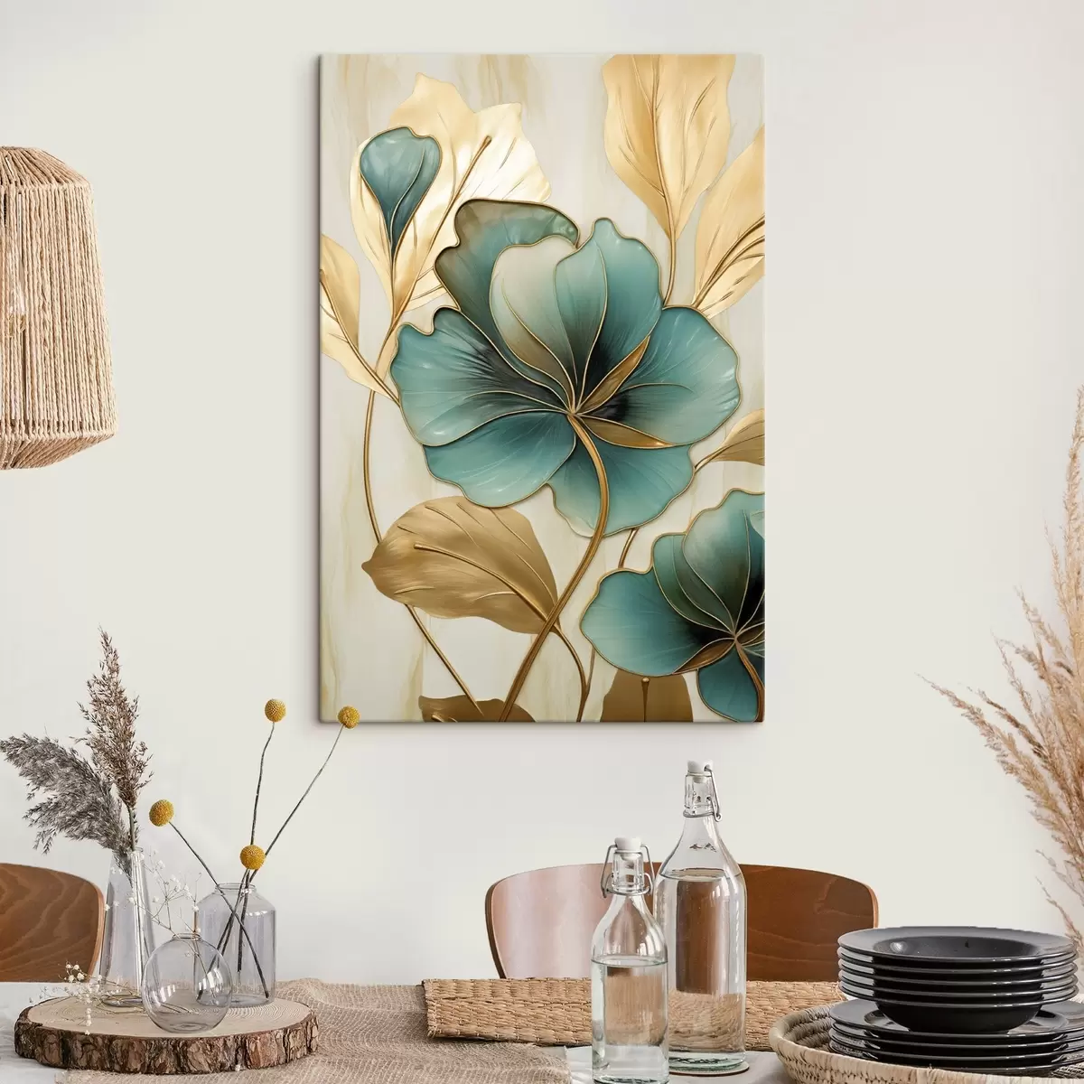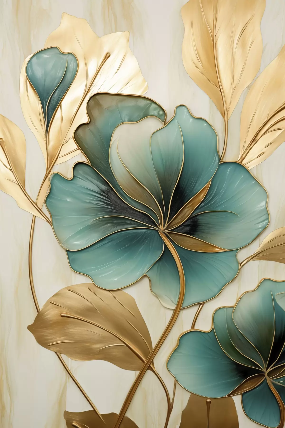 Paveikslas Didelės žalios ir geltonos gėlės su kontūrais, apsuptos geltonų lapų ant abstraktaus fono Nr s47419
