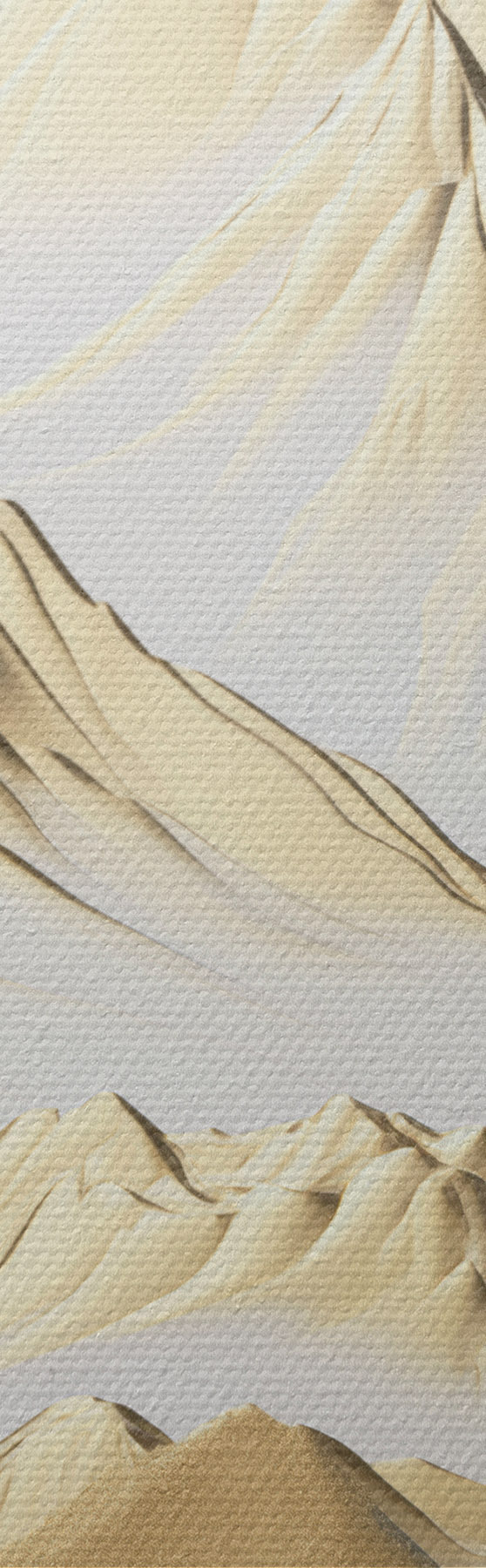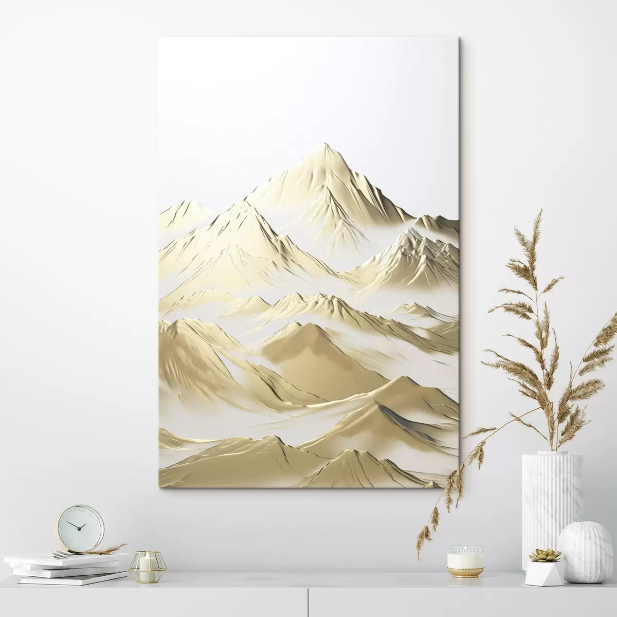 Paveikslas Geltonos, sniegu padengtos kalvos su smailiais viršūnių ir giliomis slėnių po šviesiu dangumi Nr s47421