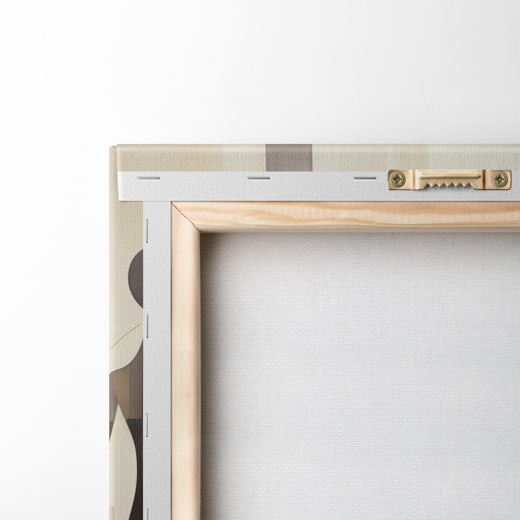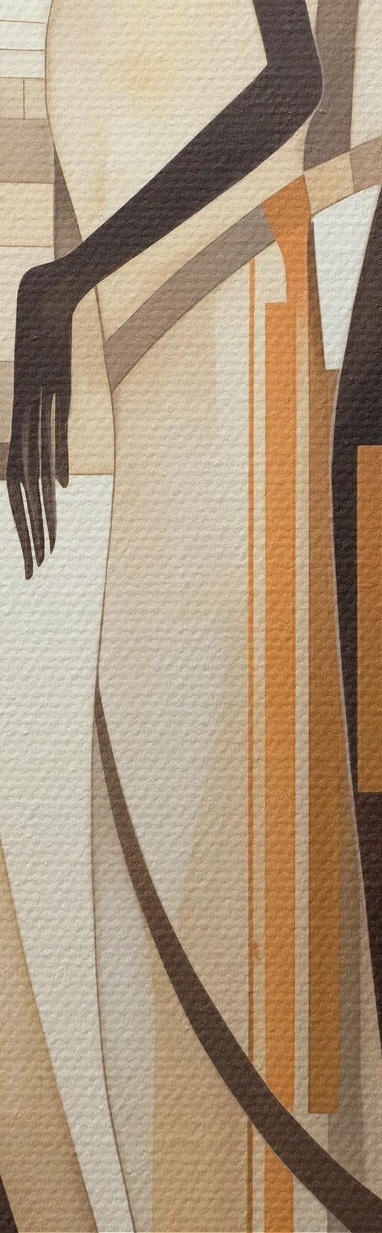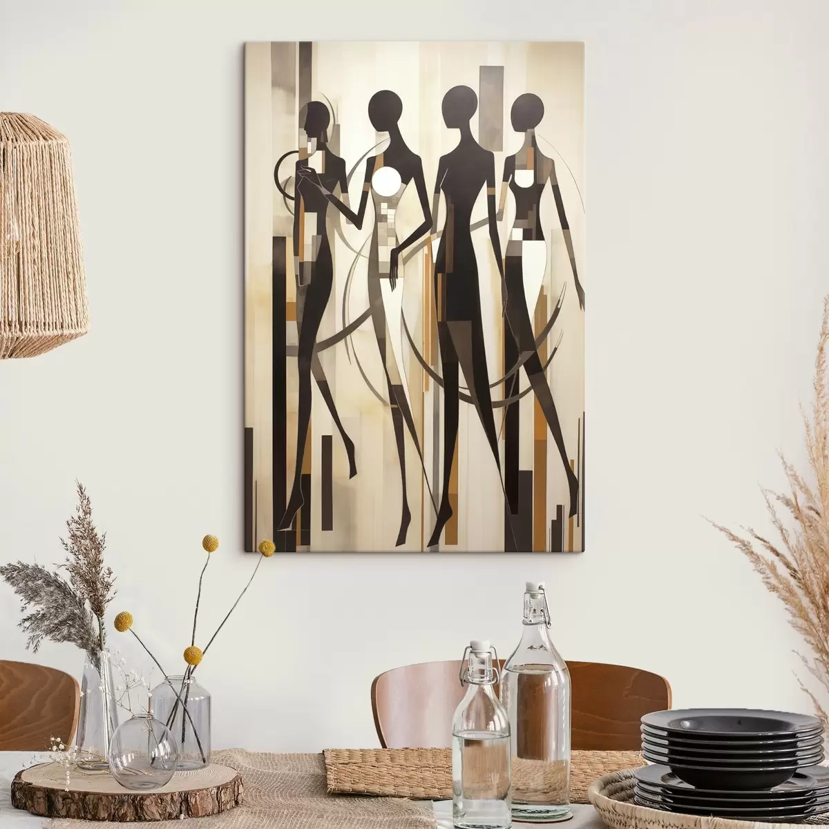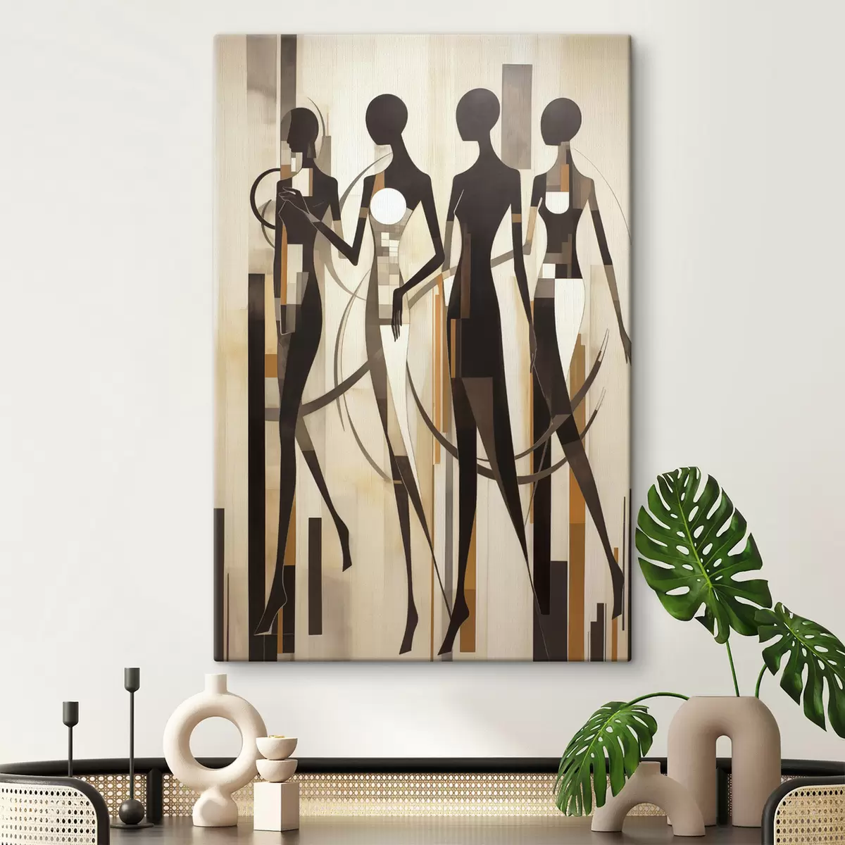 Paveikslas Stilizuotos moteriškos figūros su geometriniais elementais ant abstraktaus vertikalių linijų fono Nr s47423