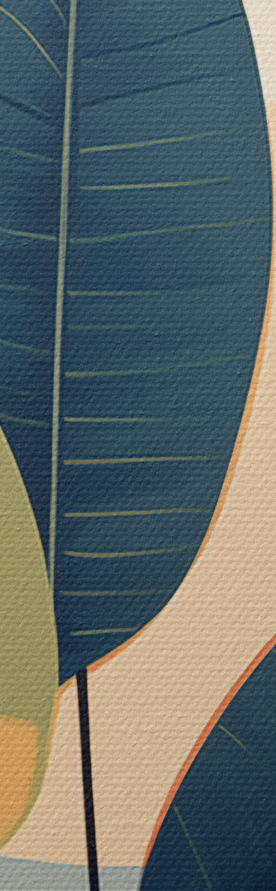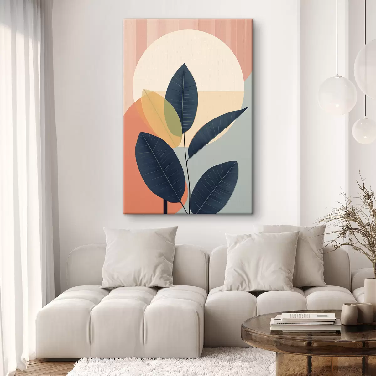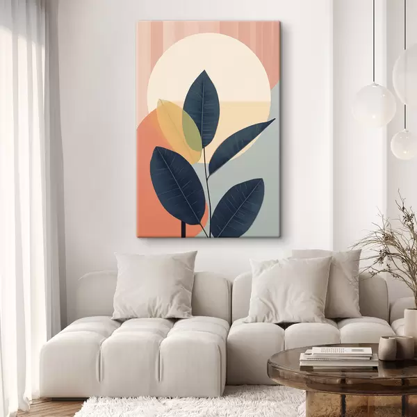 Paveikslas Tamsūs lapai ant persikų ir pilkos spalvos abstrakčių formų fono su dideliu, šviesiai geltonu ratu Nr s47424