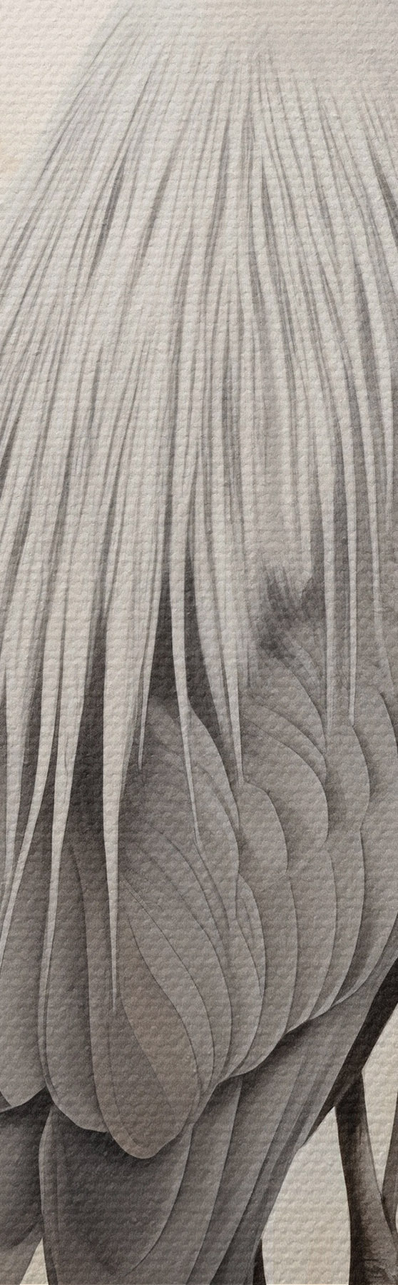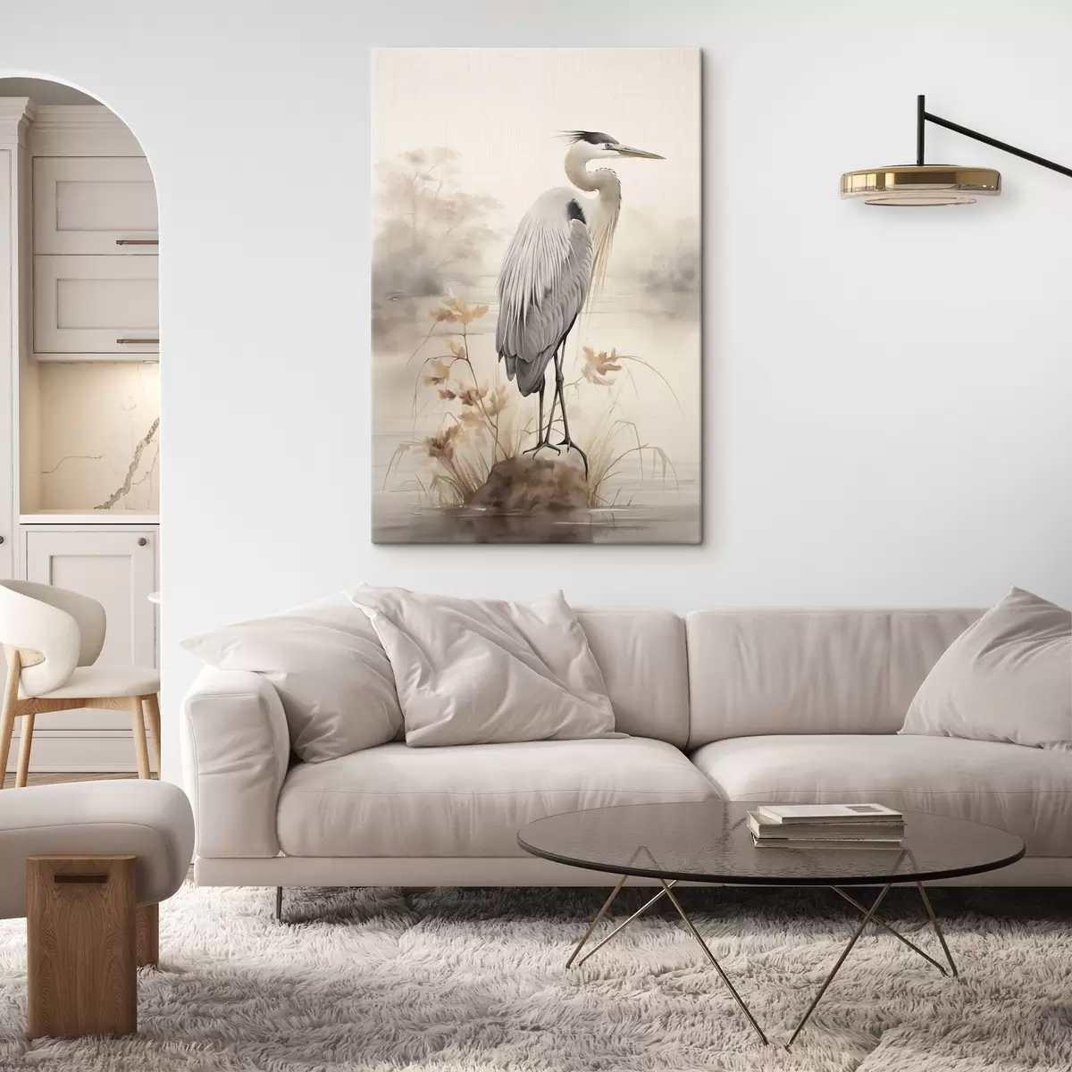 Paveikslas Gervė stovi ant uolos ežere, o fone matyti aukšti žolynai ir medžiai. Nr s47426