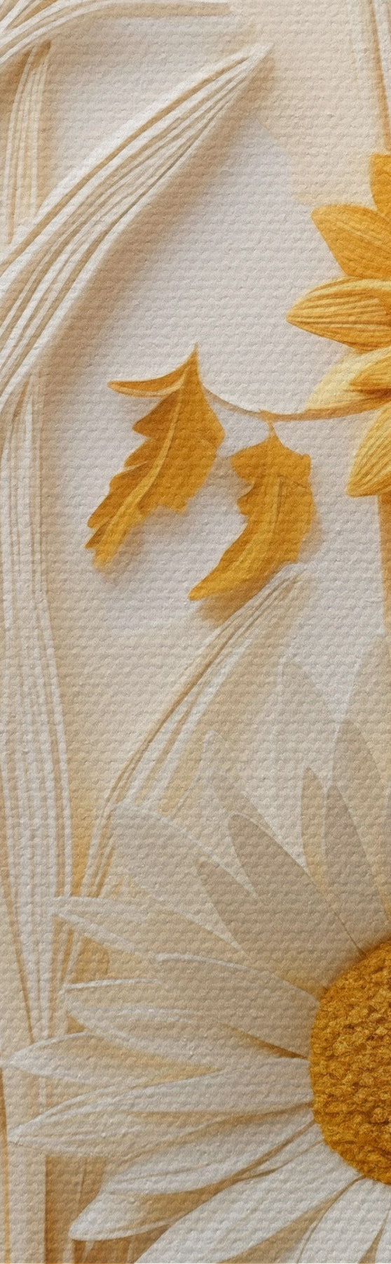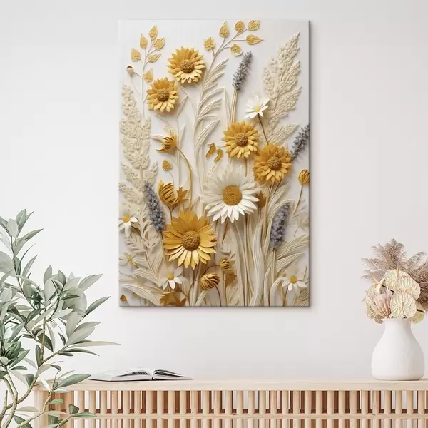 Paveikslas Tekstūruota geltonų ir baltų saulėgrąžų kompozicija su džiovintomis žolėmis ir levandų šakelėmis ant balto fono. Nr s47430